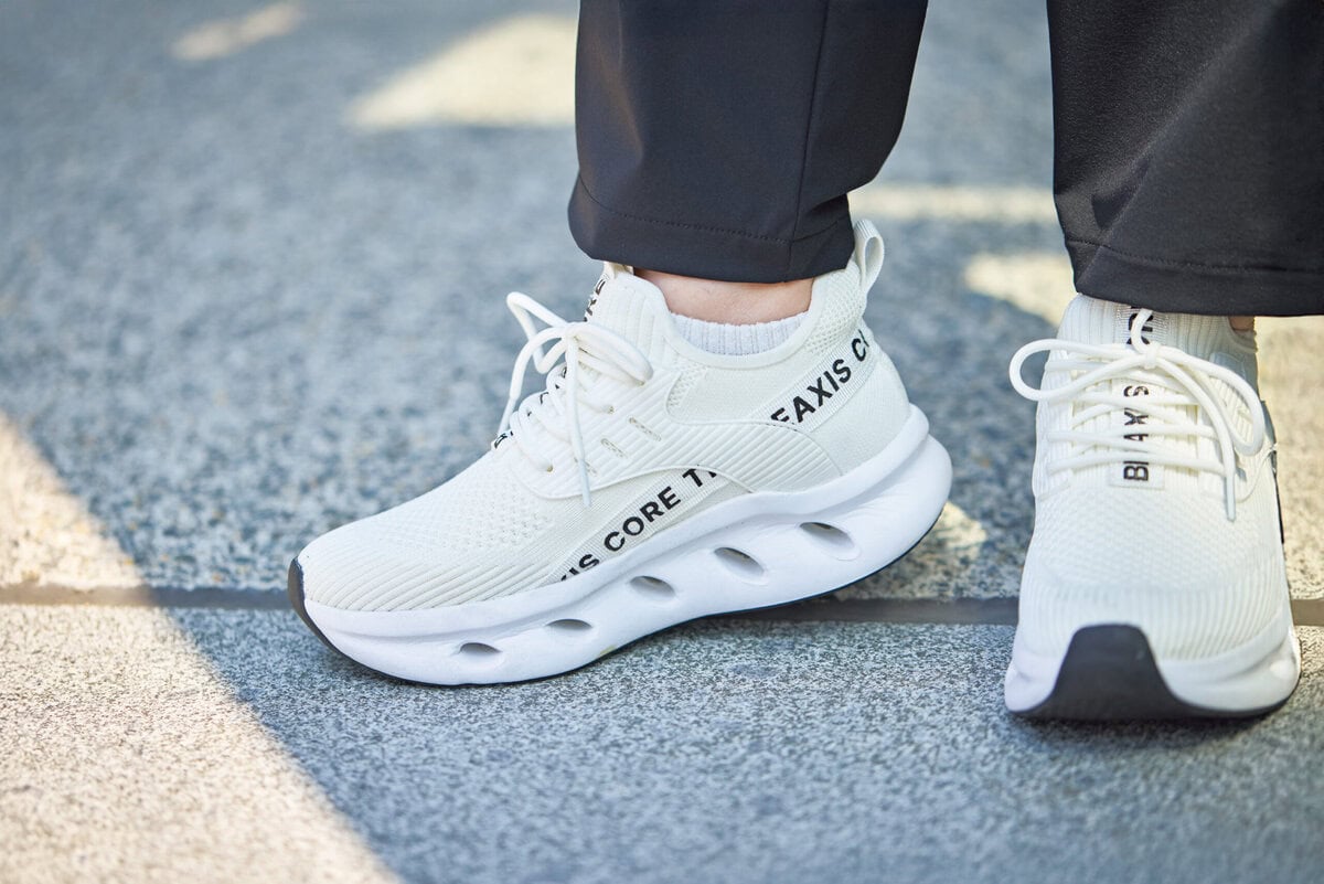 「『ビーアクシス』のシューズは、爽やかな白できれいめの服にも合わせやすい1足。軽くて歩きやすいうえに、ダイエット効果も」