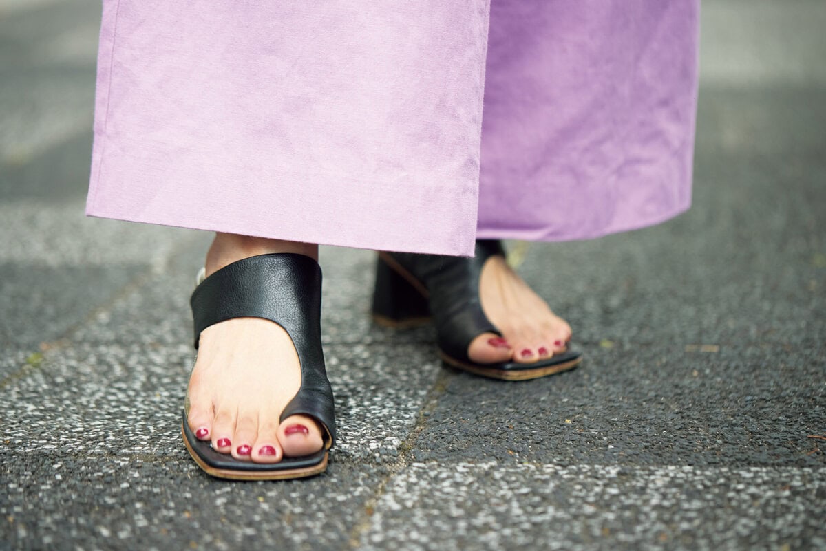 「履いていると必ず褒められる『ファビオルスコーニ』のサンダルは、着こなしのスパイスに。革がなじんで履きやすいのもお気に入り」