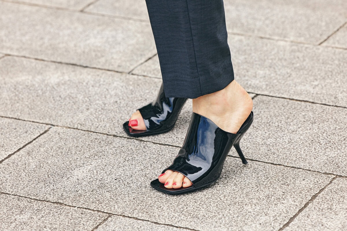ミュールサンダルは「フェラガモ」。細ヒールと抜け感で女らしい足元に。「シンプルコーデが多いので足元はインパクトのあるものを」