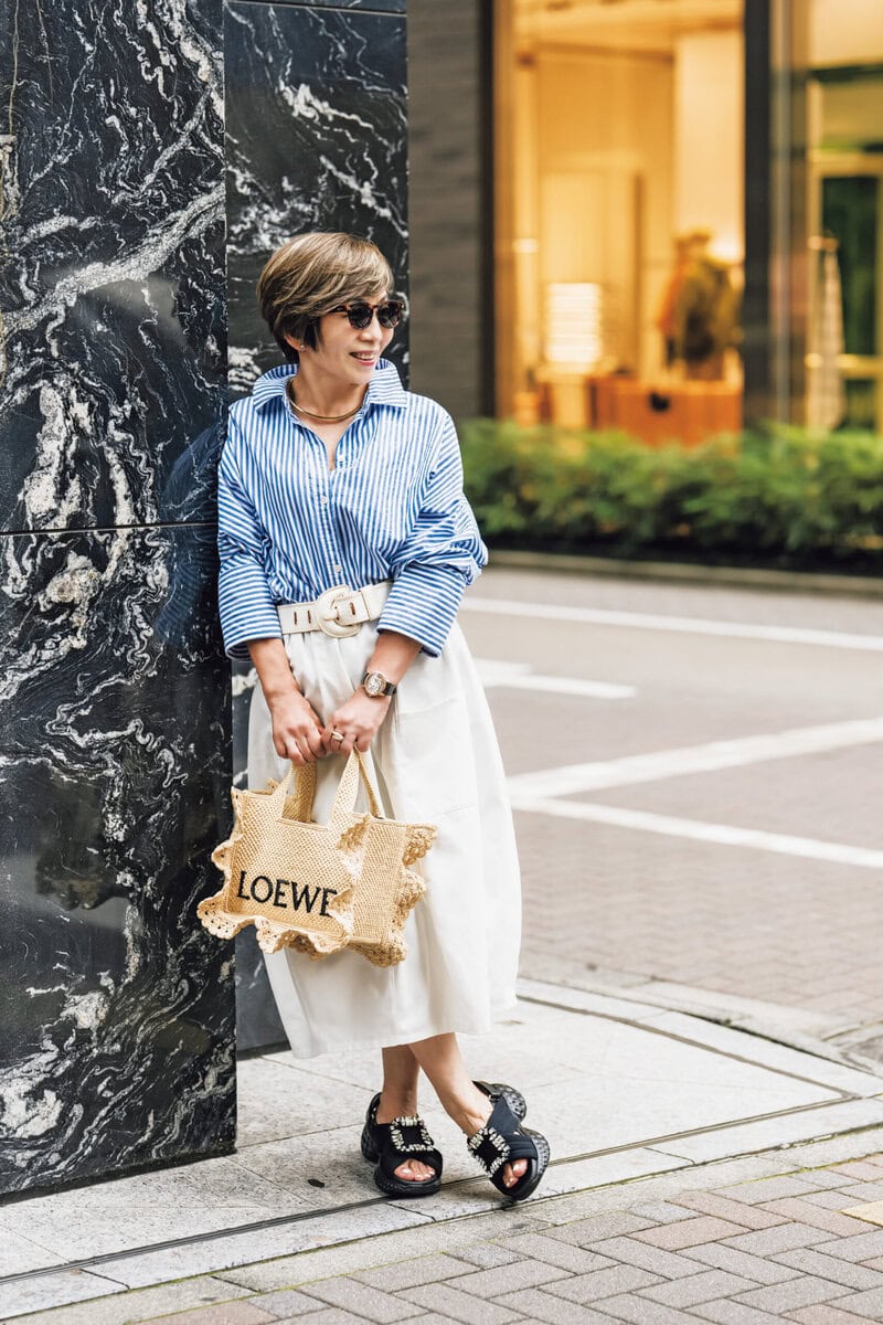 シンプルなスタイルのアイテム選びはもちろん、靴、バッグ、アクセ、時計と小物使いまで、おしゃれが凝縮されたお見事なコーディネート。チアリーディング練習の後に銀ブラというのも、只者ならぬカッコよさです!
