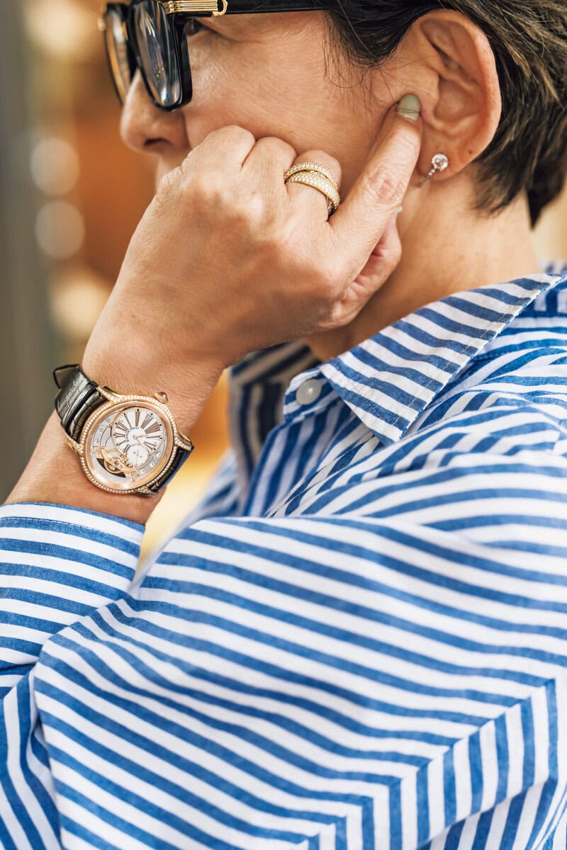 時計は「オーデマピゲ」、リングは「カルティエ」。どちらも夫からのプレゼント。「サングラスは、私のおしゃれの必需品です」