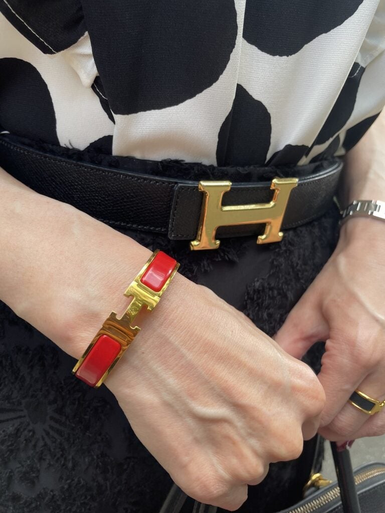 「ゴールドのロゴとバングルのレッドを差し色にしたくてベルトとバングルとリングは『HERMES』にしました。モノトーンの中に小物で色を入れるのが好きで、何色か持っているのですが、秋らしくレッドをチョイス。夏ならイエローを選んだりします」
