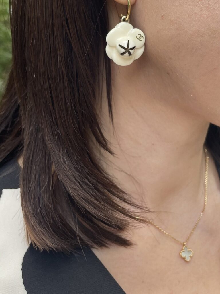 「ピアスは『CHANEL』のカメリアデザインのものを。ペンダントは『Van Cleef & Arpels』の白をチョイス。どちらもトップスのモノトーンのお花のデザインに寄せて選びました」