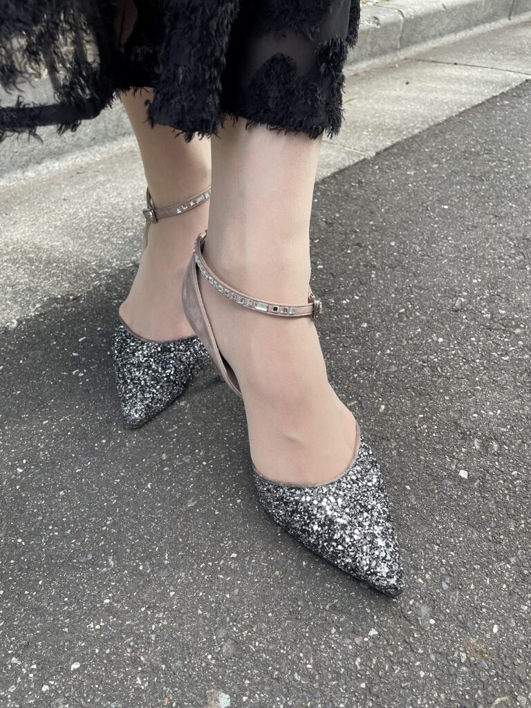 「靴は『ダイアナ』のブラックベースのラメが輝くシルバーのパンプスにしました。モノトーンでも足元には上品な輝きで華やかさをプラス。アンクルベルト部分もビジューがデザインされていて細部まで凝ったつくりが気に入っています。色違いでゴールドも持っているのですが、今日は抑え目なトーンのシルバーに」