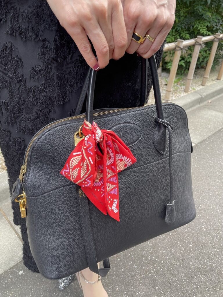 「モノトーンの『HERMES』のバッグの持ち手に結んだスカーフもバングルの赤に揃えてアクセントに」