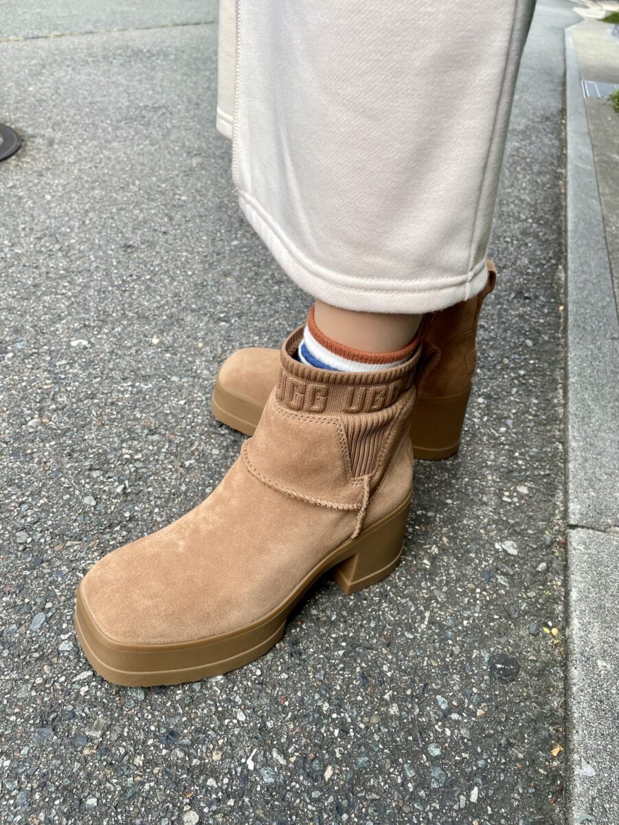 ブーツは「UGG」。「ヒールつきなのでカジュアルになりすぎず、いろいろな装いに合わせやすくてお気に入りです」