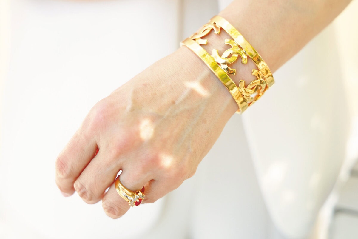 「シャネル」のゴージャスなバングル。「シンプルななかに“ときめき”を感じる華やかさをプラスするのが好きです」
