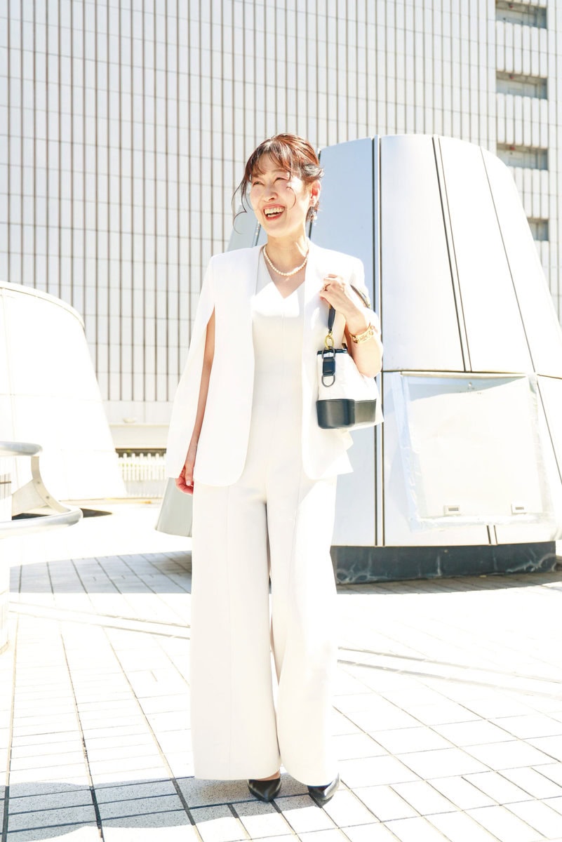美容家の仕事柄、身に着けるものも肌にやさしい素材を選ぶという山口さん。「『シソラス』ならではの上質な素材が映えるオールインワンは、着心地のよさときちんと感のバランスが気に入っています」。「ザラ」のジャケットは袖がないデザイン。