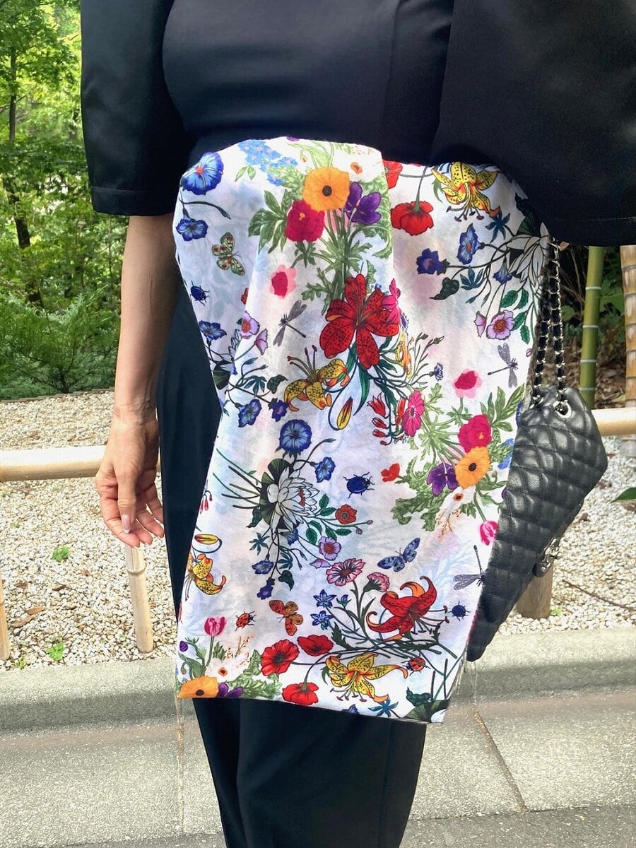 「フラワープリントのスカーフはこの春にイタリア・フィレンツェに旅行に行った際、路面店で一目惚れで購入したもの。寒かったら肩からかけようと持ってきました。大判のスカーフ一枚持ち歩くと、この時期は安心感がありますよね。手に持っても目立つデザインのものを選んでワンポイントに」