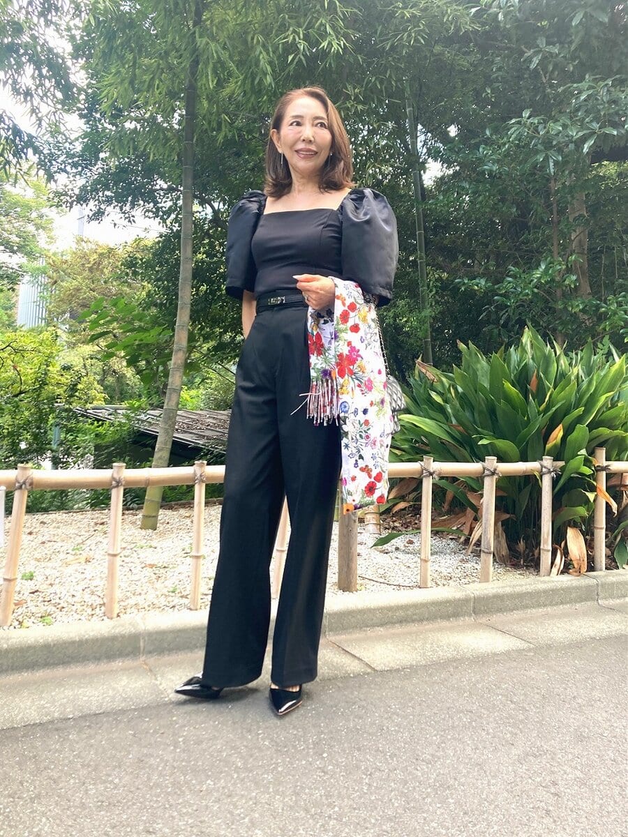 オールブラックのコーディネートに、ベルトの金具やエナメルのパンプスといった光沢のある素材をプラスして華やかなパーティ感を演出されているところはお見事。手に持ったスカーフもフラワープリントが引き立ちアクセントになっていて素敵です。