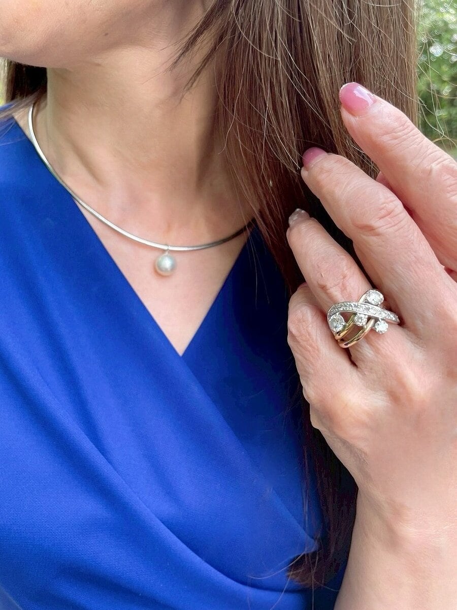 「パールの一連のネックレスから、首のサイズに合わせて、一粒を取り、ペンダントトップに仕立ててもらいました。オメガタイプのチェーンとの相性が良く、とても使いやすいお気に入りです。リングは母が持っていたダイヤモンドと、夫から贈られたダイヤモンドをひとつの指輪としてデザインし直したものです。思いが重なった特別なリングなんです」