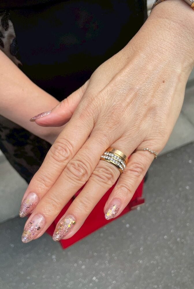 「ネイルには『人とのご縁』という思いで丸いものをつなげたデザインを入れています。運気UPに金箔も織り交ぜています」