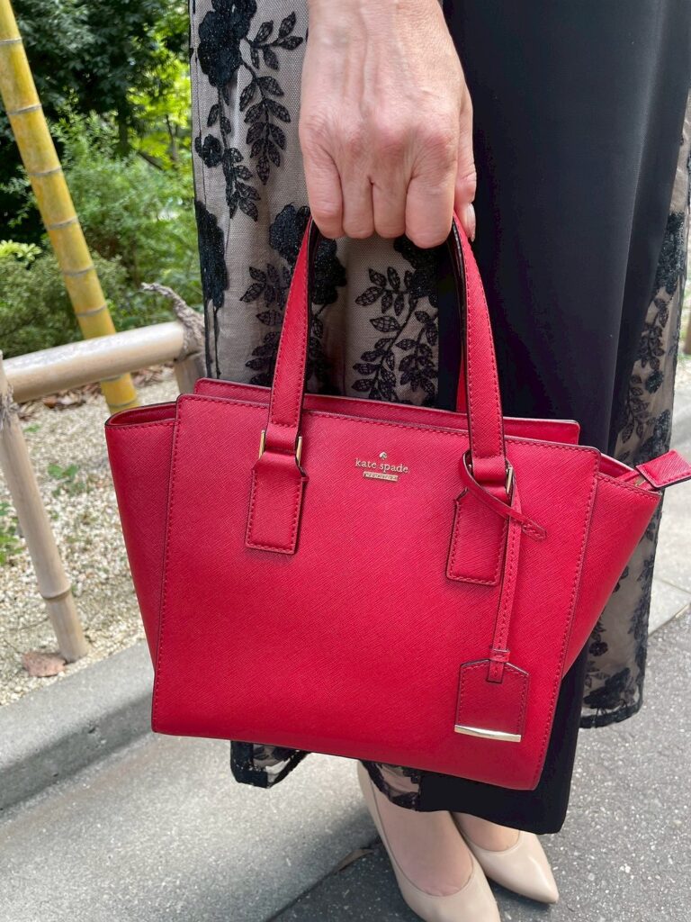 自然と視覚効果が計算されたデザインのワンピースがエレガントで素敵です。黒を卒業したいという思いからアクセサリーやバッグなどの小物からカラーを上手に取り入れているところは、同じような思いの方にも真似したくなるポイントですね。