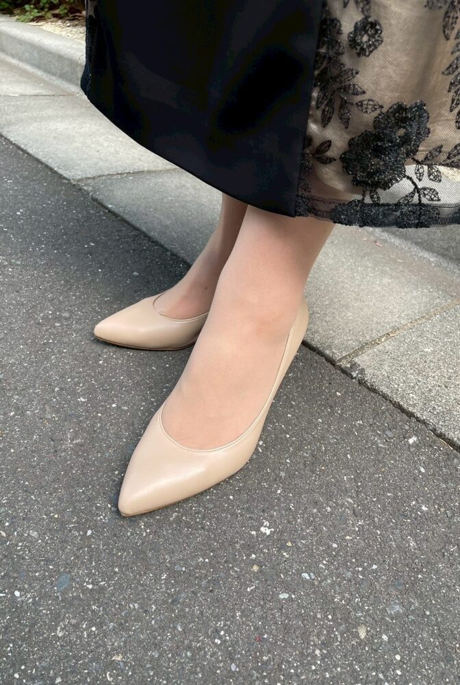 「靴は丈の長いワンピにあわせてヒール高めの『ダイアナ』のパンプス。カラーはシースルー部分のベージュに合わせました。『setaichiro』の服は3センチヒールを推奨されているんですけど、私は背が低いので高めのものを選んでます」