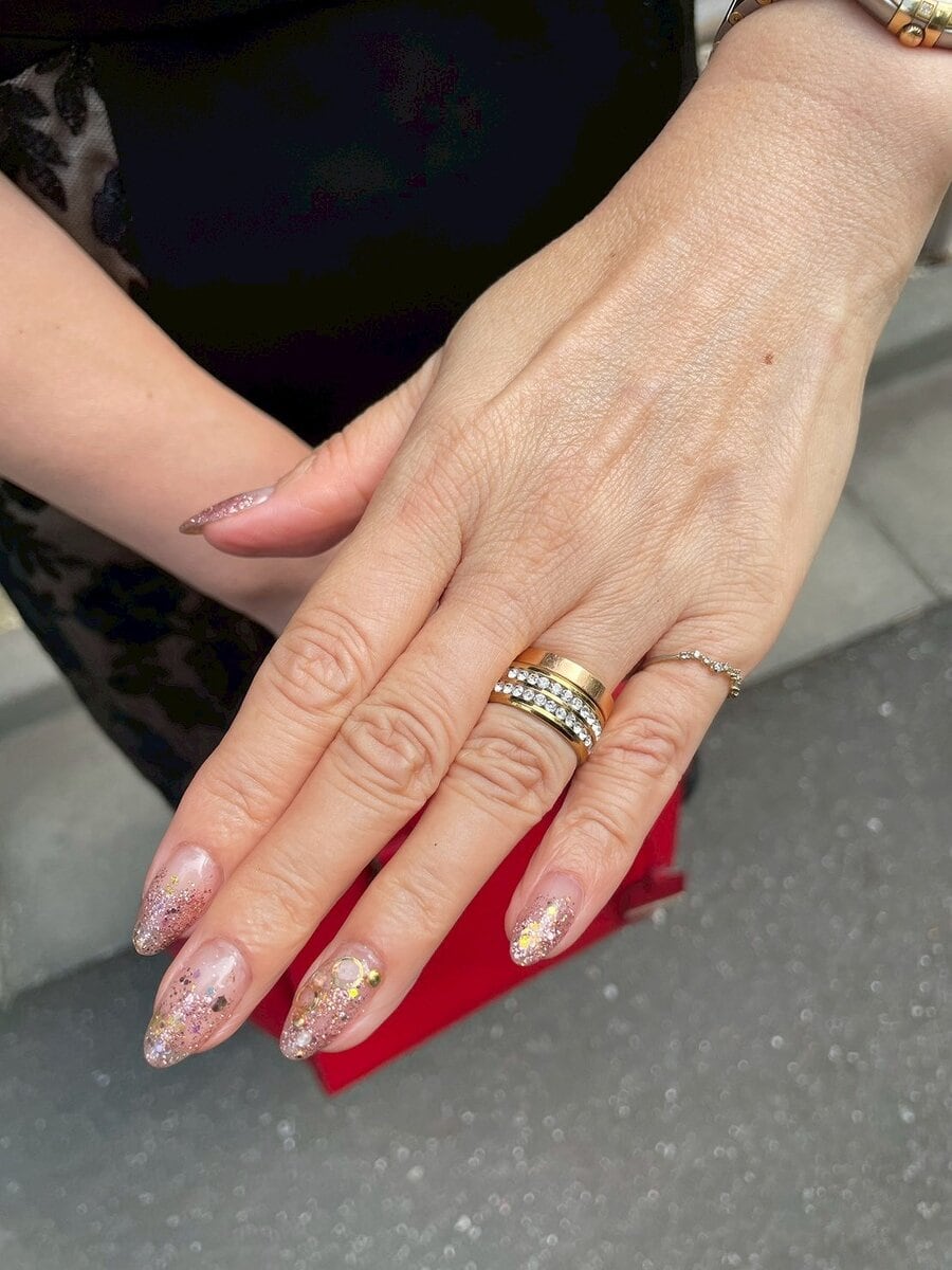 「ネイルには『人とのご縁』という思いで丸いものをつなげたデザインを入れています。運気UPに金箔も織り交ぜています」