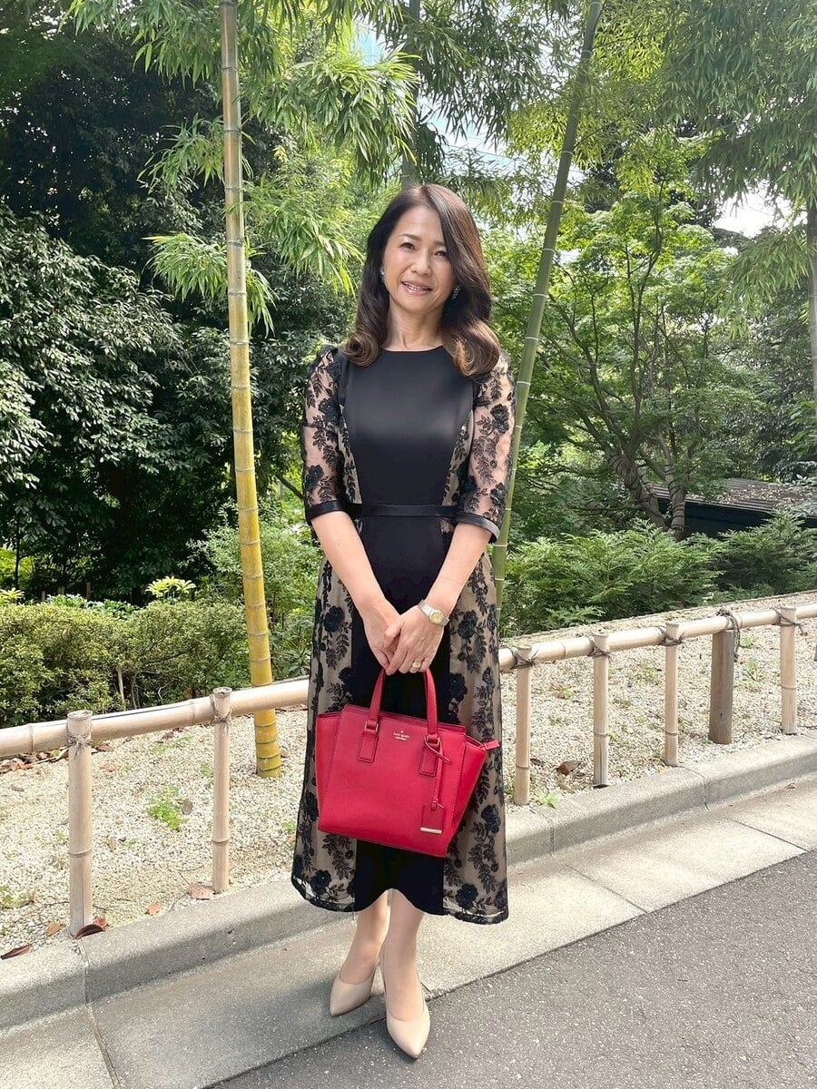 自然と視覚効果が計算されたデザインのワンピースがエレガントで素敵です。黒を卒業したいという思いからアクセサリーやバッグなどの小物からカラーを上手に取り入れているところは、同じような思いの方にも真似したくなるポイントですね。
