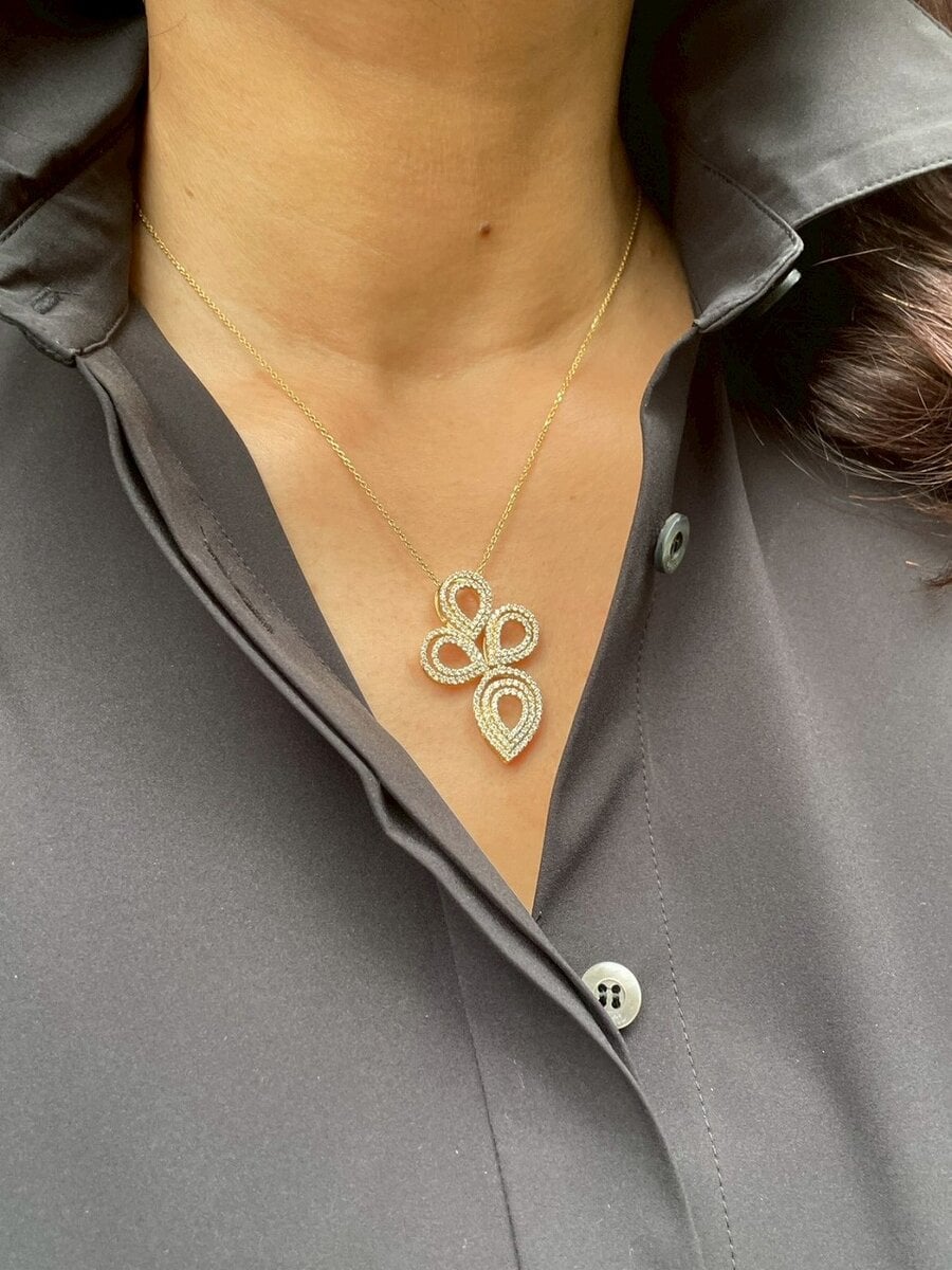 「首元は重厚感と繊細さが共存しているデザインのアンティークのネックレスをチョイス。ひとつ付けるだけで雰囲気が変わります。 時間を重ねたジュエリーならではの深みのある輝きにとても惹かれて購入しました」