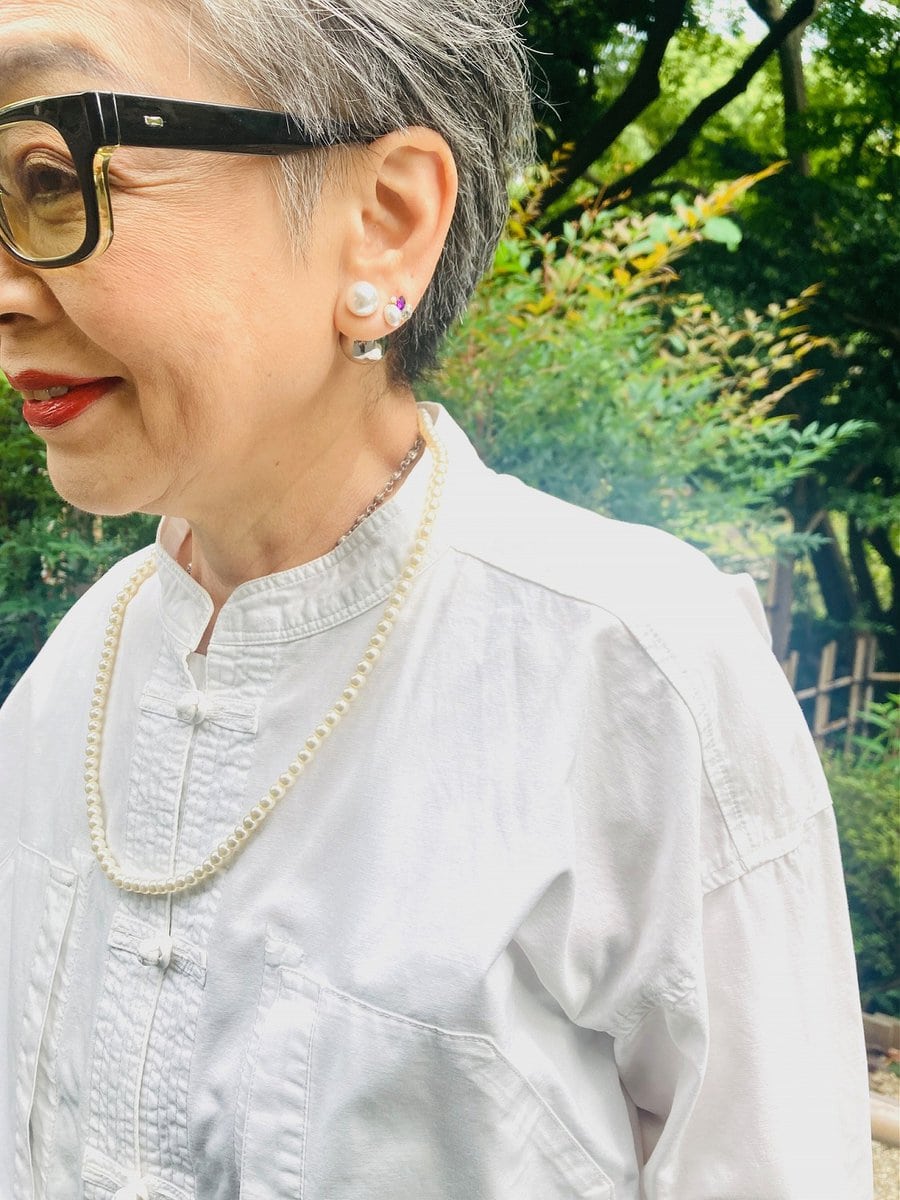 「ネックレスのパールはおもちゃのプチプラなんです。YouTubeでも発信していますが、プチプラを上手く取り入れたコーデをご紹介しています。プチプラでもなんでも、自分に合うものが一番。高価でも自分に合わないと意味がないですから。薄いグレーのレンズのサングラスも、フレームがしっかりとしてインパクトがありつつ上品さを出してくれます」