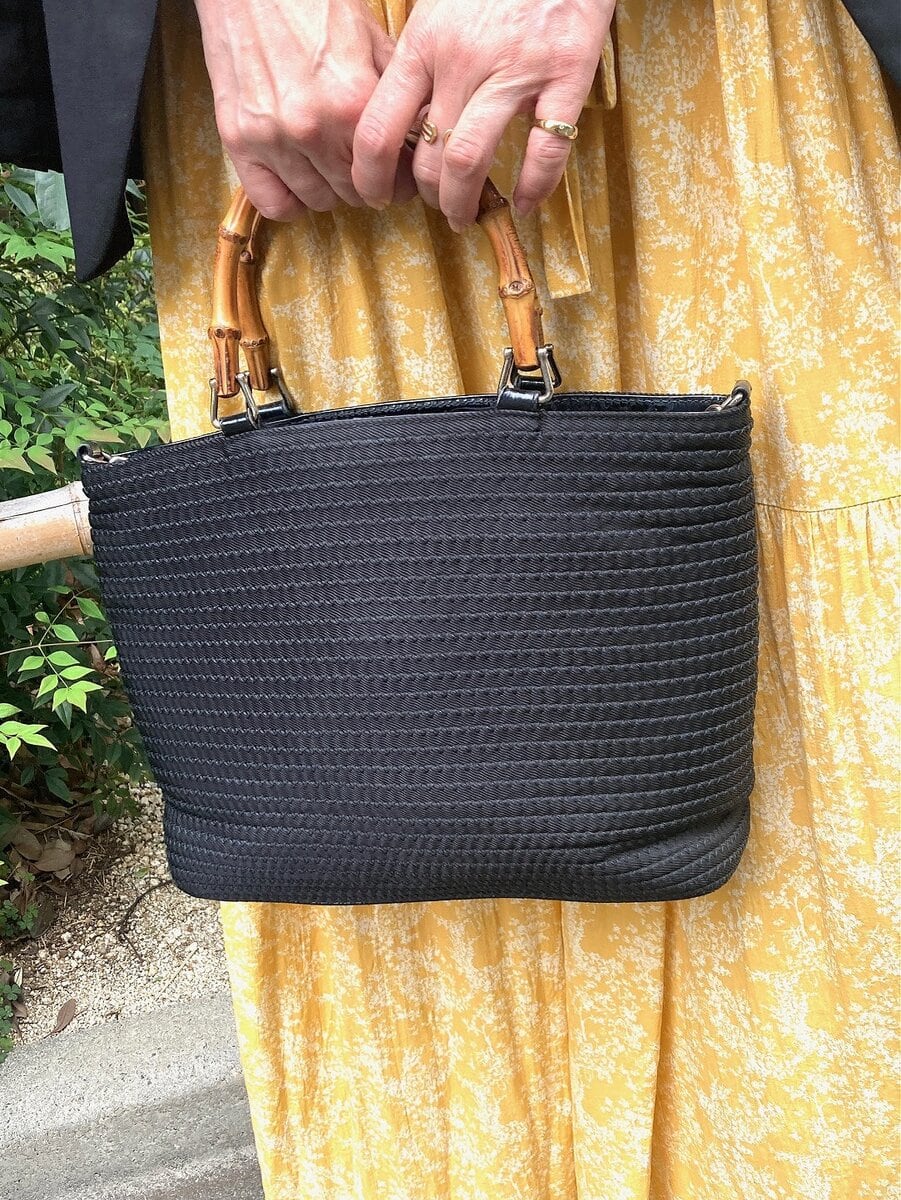 「バッグは『Gucci』の黒いハンドバッグに。ジャケットや靴に合わせた黒と、バンブーがワンピースの色にも馴染んでいいなかなとこちらをチョイス」