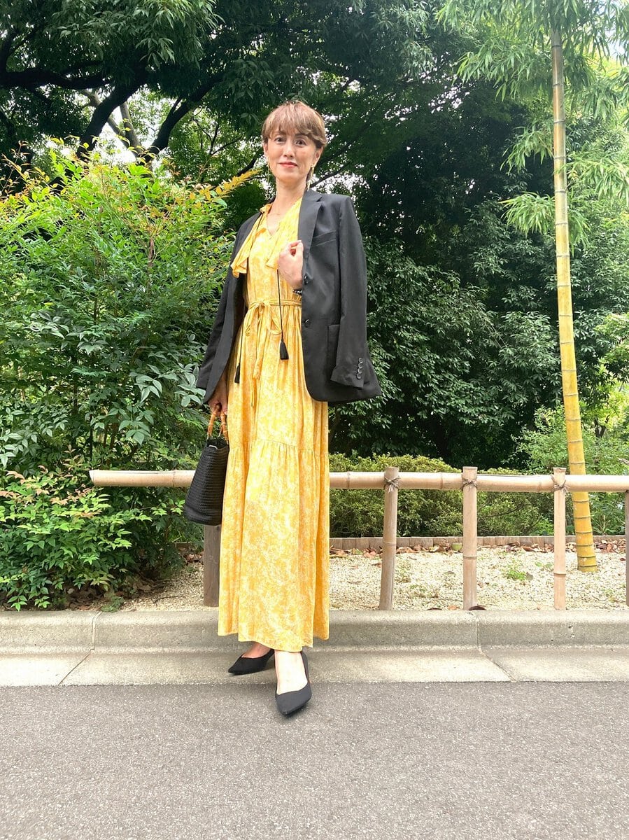 この日は素敵なあの人のイベントに参加していた須賀さん。「髪も短く、普段はハンサム系のファッションが多い女性らしいギャップを楽しむべく品の良さもある『Make-i』のワンピースにしました。これからの季節、ダークトーンになりがちなのでビタミンカラーで明るく元気に。『ユニクロ』の黒のジャケットを合わせてハンサム系の自分の個性も入れてみました。『ZARA』で買った靴も、ワンピースのフリンジの黒とバッグの黒でリンクさせてみました。『ZARA』は今っぽさを取り入れやすいのでいつもパトロールしていて、トレンドや傾向を探すのが楽しくてよくチェックしています」