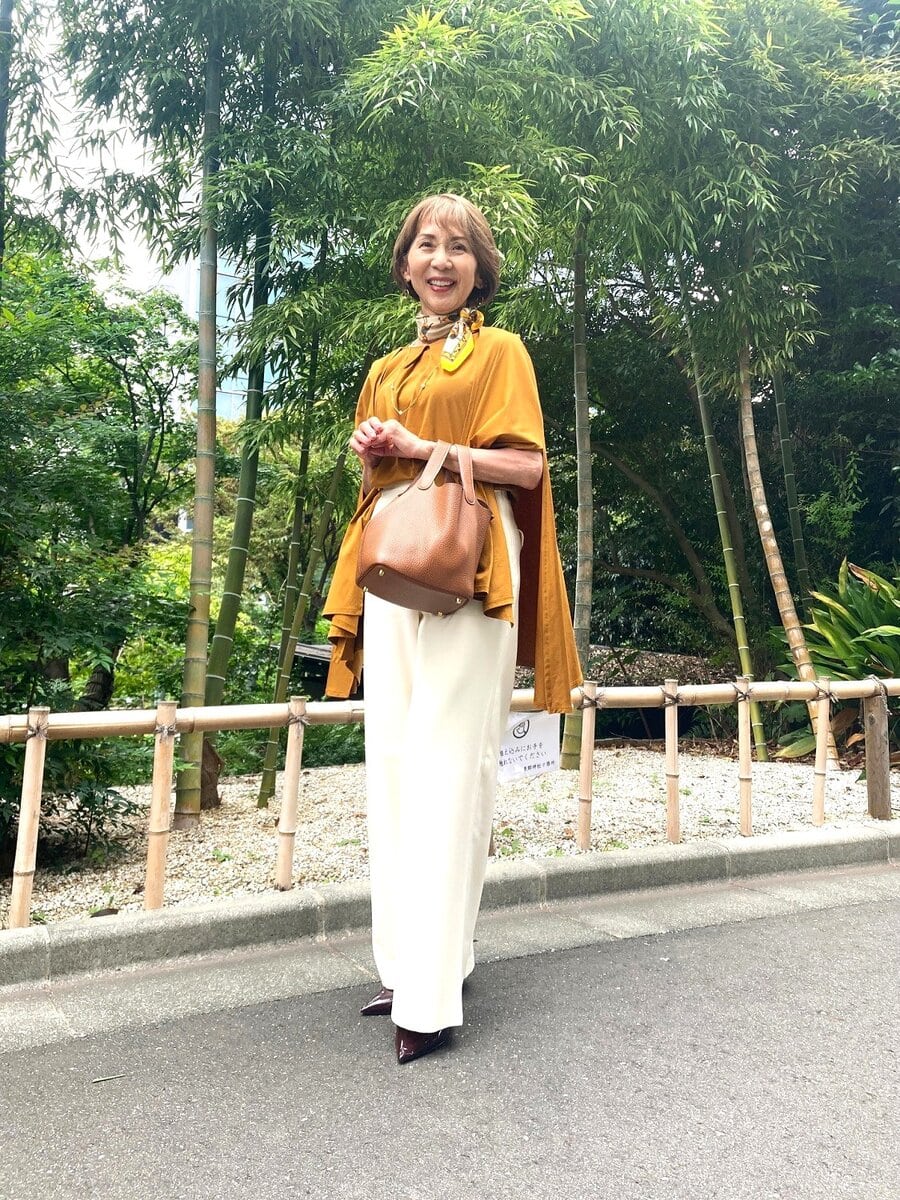 秋色のマントスリーブのトップスが夏から秋へと変わる季節にぴったりの装い。前はパンツにインしてすっきりとさせつつ、スリーブのドレープがエレガントに揺れて素敵です。ワンポイントのスカーフで華やかさも上手に演出されていました。