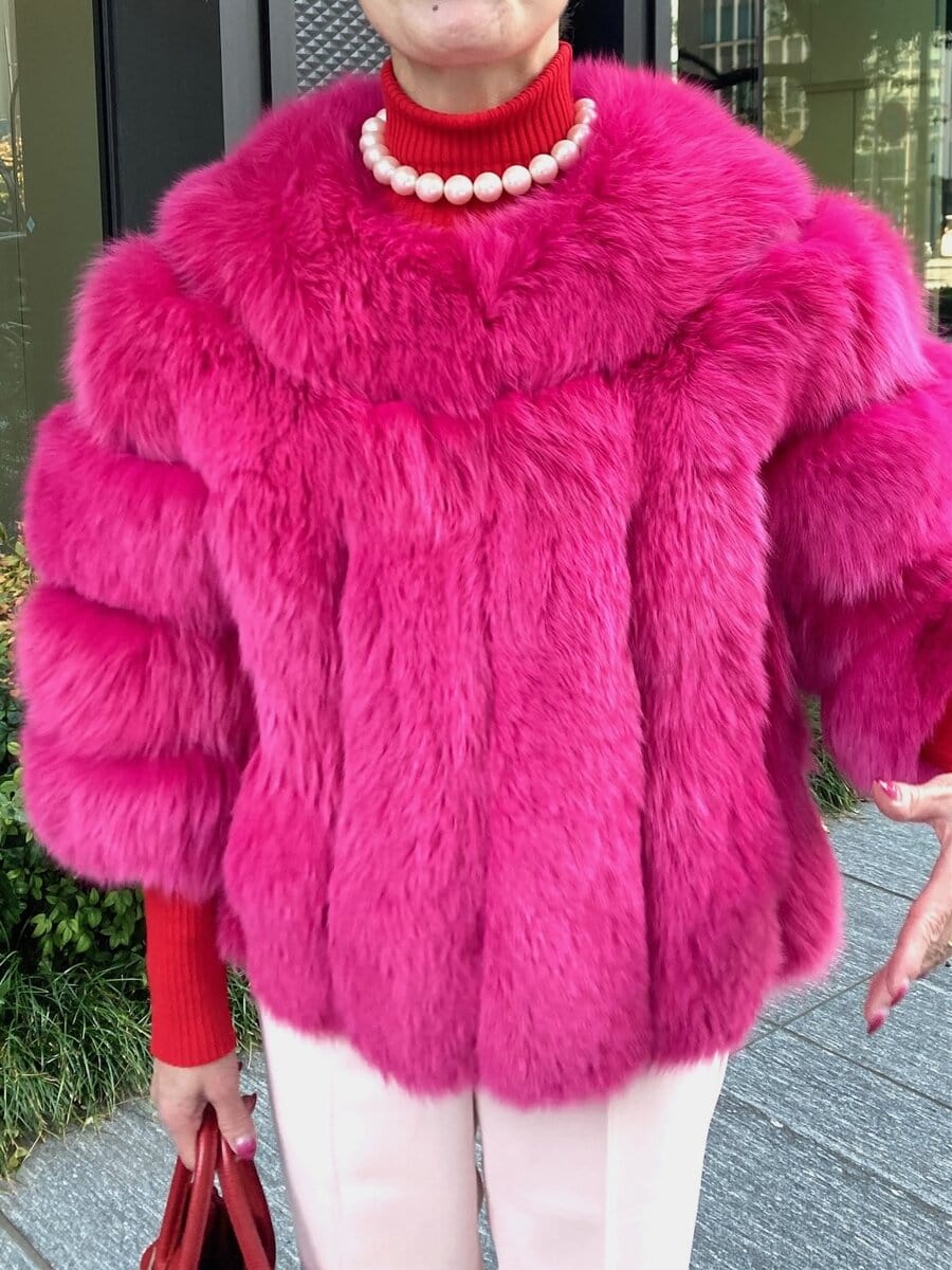 「首元に大ぶりなパールネックレスをつけることで、レフ板効果はもちろん赤やピンクとの対比が際立ち顔まわりをスッキリ見せることができました」