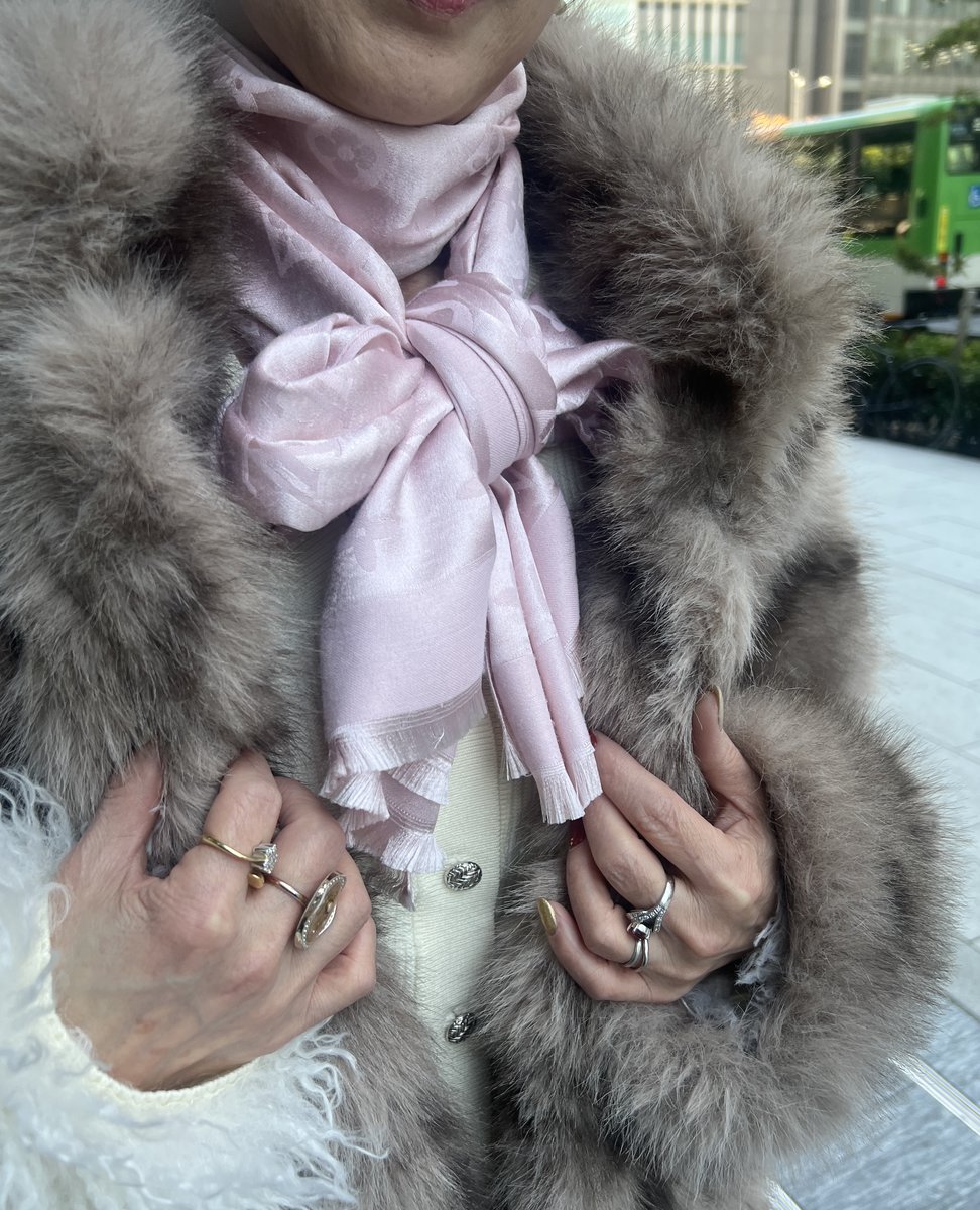 「もともと白やピンクが好きなので、首元は『ルイ・ヴィトン』のストールをリボンに結びアクセントに。顔まわりがパッと上品&華やかに着地します♡手元は母から譲り受けたルビーのリングはお守り代わりにいつも付けていて、他のリングはTPOやその日の気分でセレクトしています」