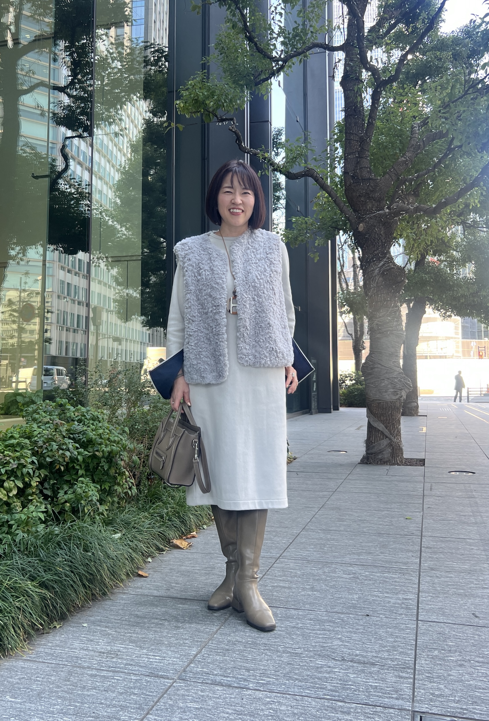 「胸元がシンプルだったのでアクセントとしてエルメスのネックレスをプラス。手首のバングルもエルメスのものですが、実はグレージュと白のリバーシブルなんです。ワンピースやバッグ・ブーツのトーンに合わせて今回はグレージュをチョイス。控えめながらもゴールドの金具がさりげなく上品な手元に」