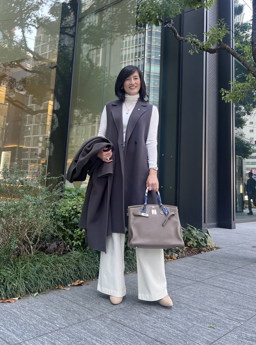 この日は素敵なあの人のイベントに参加していた豊田真由美さん。「暗い色が多いので白を着たいと思って、シアーなタートルネックニットとワイドパンツ、パンプスを白で。ジレ&コートのセットとバッグはグレー系で揃えてIラインを強調しました」