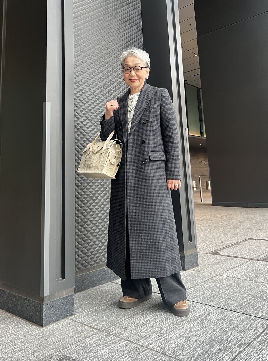 この日は素敵なあの人のイベントに参加していたきょうこばぁばさん。「品よく煌びやかになりすぎないコーデにしたいと思ってダークトーンのコートに合わせたアイテム選びをしました。ニットはコートのグレーとリンクさせつつ、顔まわりが明るくなる白がメインのニットをセレクトしました」