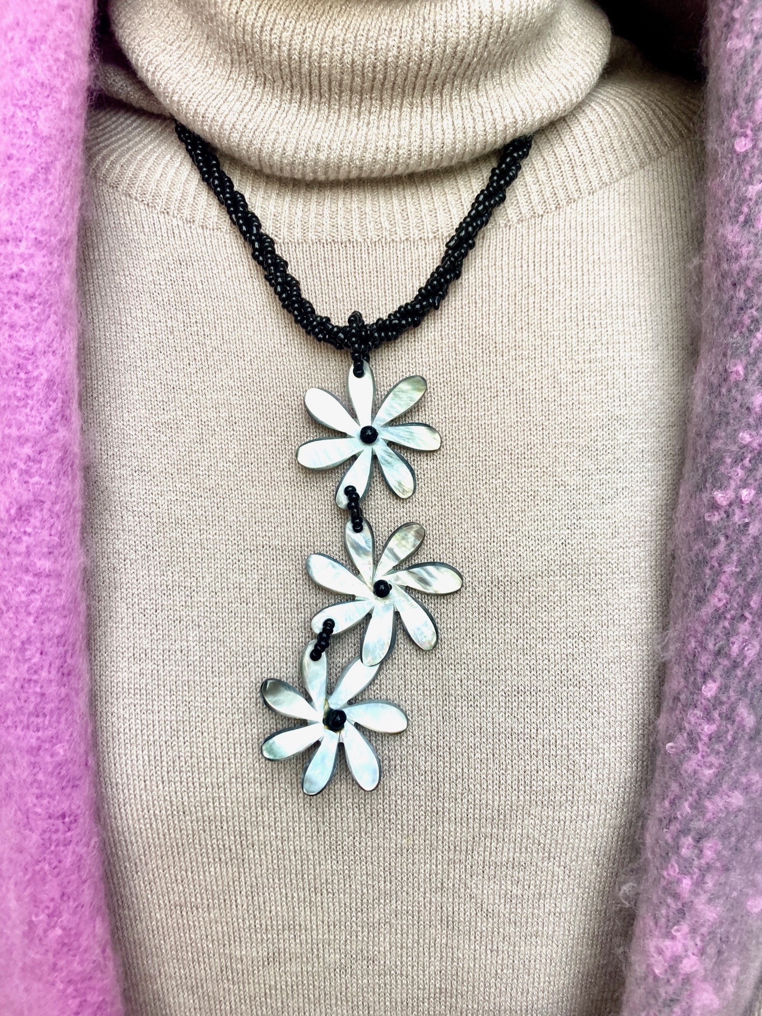 「シェルネックレスのグレーのような自然な光沢感がグレーヘアにマッチすると思ってチョイスしました。ワンピースもグレー味のあるアイボリーカラーなのでちょうどいい匙加減のポイントになりました」