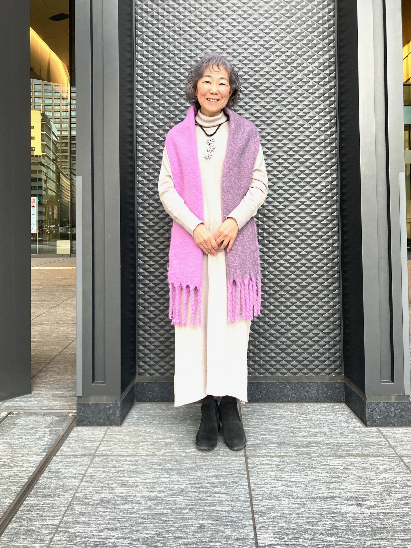 この日は素敵なあの人のイベントに参加していた清水るり子さん。「グレーヘアにしてから、何を着たらいいかわからなくなったのですが、グレーに馴染みながらも明るく映えるアイテムを合わせてコーディネートしました。髪のパープルがかった色味にマッチするピンク×パープルのストールをアクセントにしています」