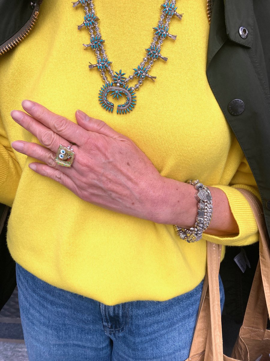 「ネックレスは黄色と好相性のターコイズのネックレスでリュクス感をコーデにプラス。スポンジボブのリングもニットに合わせて。あえてキャラクターのリングを選び、遊んでみました」