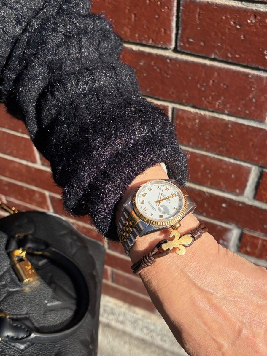 ブラックのワントーンコーデに、「ロレックス」の時計と、フィレンツェのシンボルマークがあしらわれた「ウミリス」のブレスレットを重ねづけし、さりげないレイヤードが上品な手元を演出。「インパクトのある『ロレックス』に、暖かみのあるゴールドアクセサリーを合わせて、女性らしい印象にしました」
