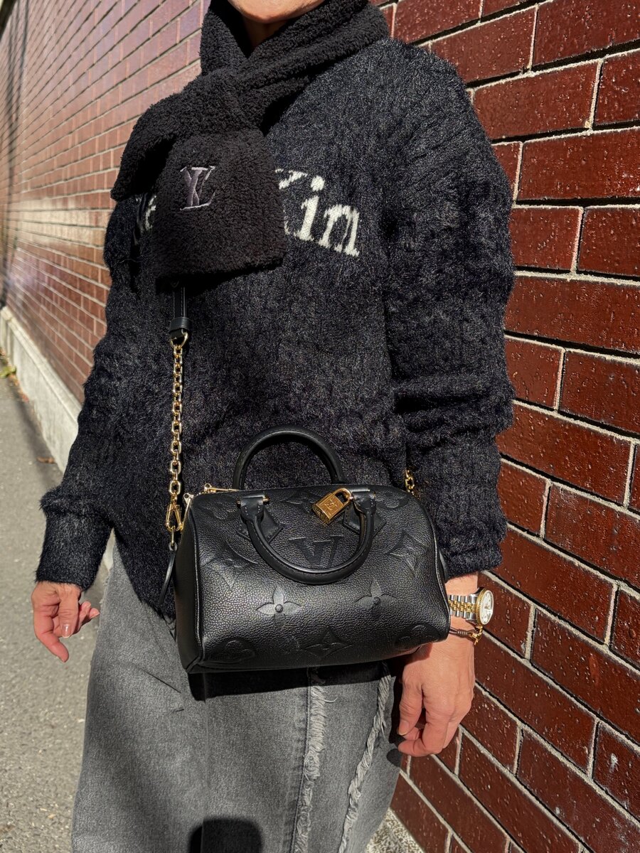 ストールとバッグは、ともに黒のモノグラムの「ルイ・ヴィトン」。 「ワントーンコーデに統一感を出したくて合わせました。ゴールドのショルダーとアクセサリーの相性も良く、デニムパンツでも品よくまとまるので大好きなスタイルです」