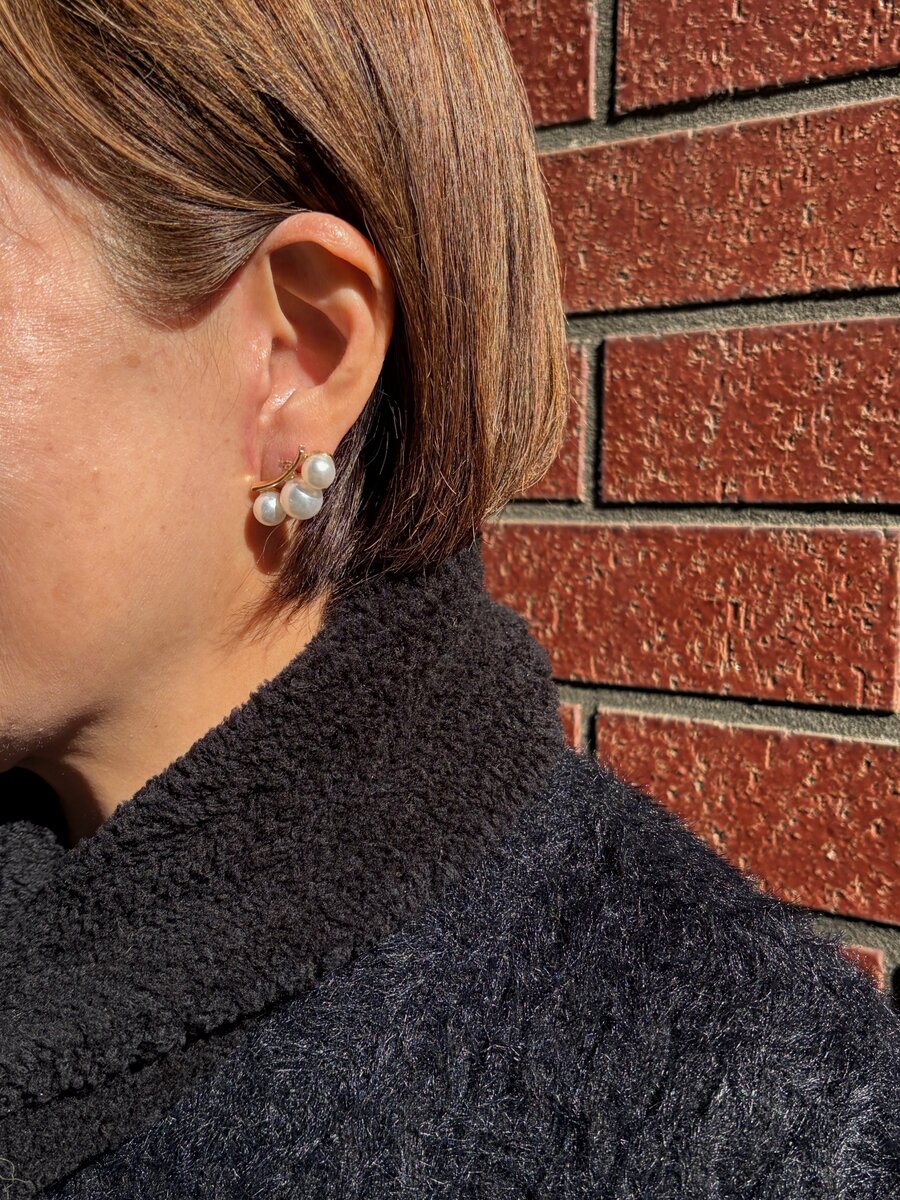 トレンド感のあるアイテムを提案する「モン カビネ」のパールピアスをチョイス。「カジュアルをきれいめにランクアップさせたくて、耳元にはパールを合わせて華やかさを出しました。3粒並んだデザインがかわいくて、一目ぼれでした」