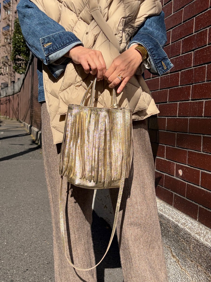 伝統的なイタリアの革製品ブランド「マーロンフィレンツェ」のゴールドカラーのバッグは、ストールのベージュとも自然に馴染み、登場回数が多いそう。「ボリューム感のあるストールに対して、胸元のアクセサリーはあえて入れず、フリンジバッグをアクセサリー代わりに持ちました。デイリーに使いやすい柔らかな革質も魅力です」
