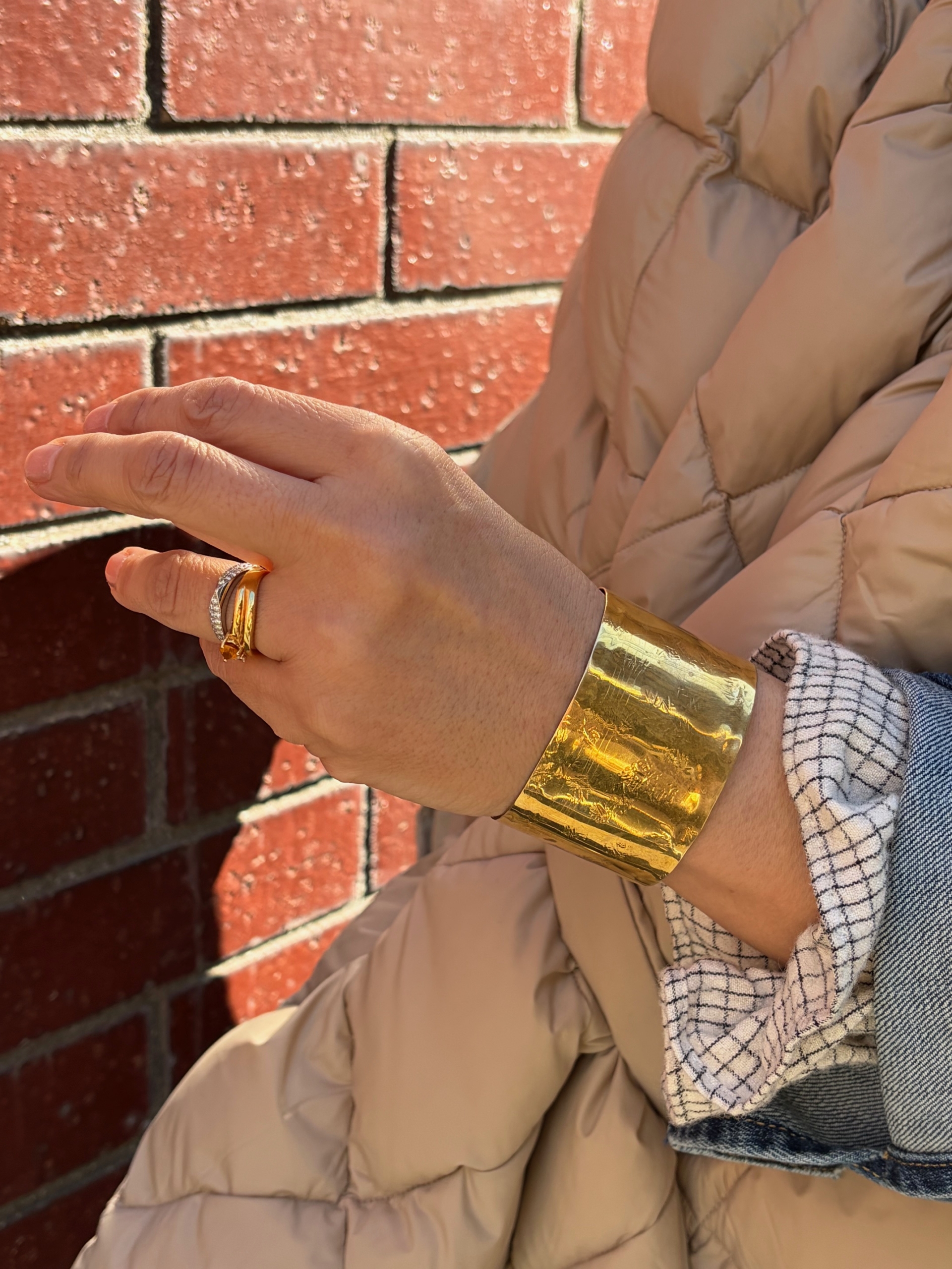 大好きな「ハグオーワー」で購入したという「アクセサリーマウ」のゴツめのゴールドバングルは、装いにほどよい存在感を添えています。「バングルには結婚指輪と、息子の誕生石であるシトリンの指輪を合わせています。華奢なアクセサリーだと埋もれてしまうところを、しっかりと支えてくれるので、どんなスタイルにも馴染みやすく、日常のアイテムとして愛用しています」