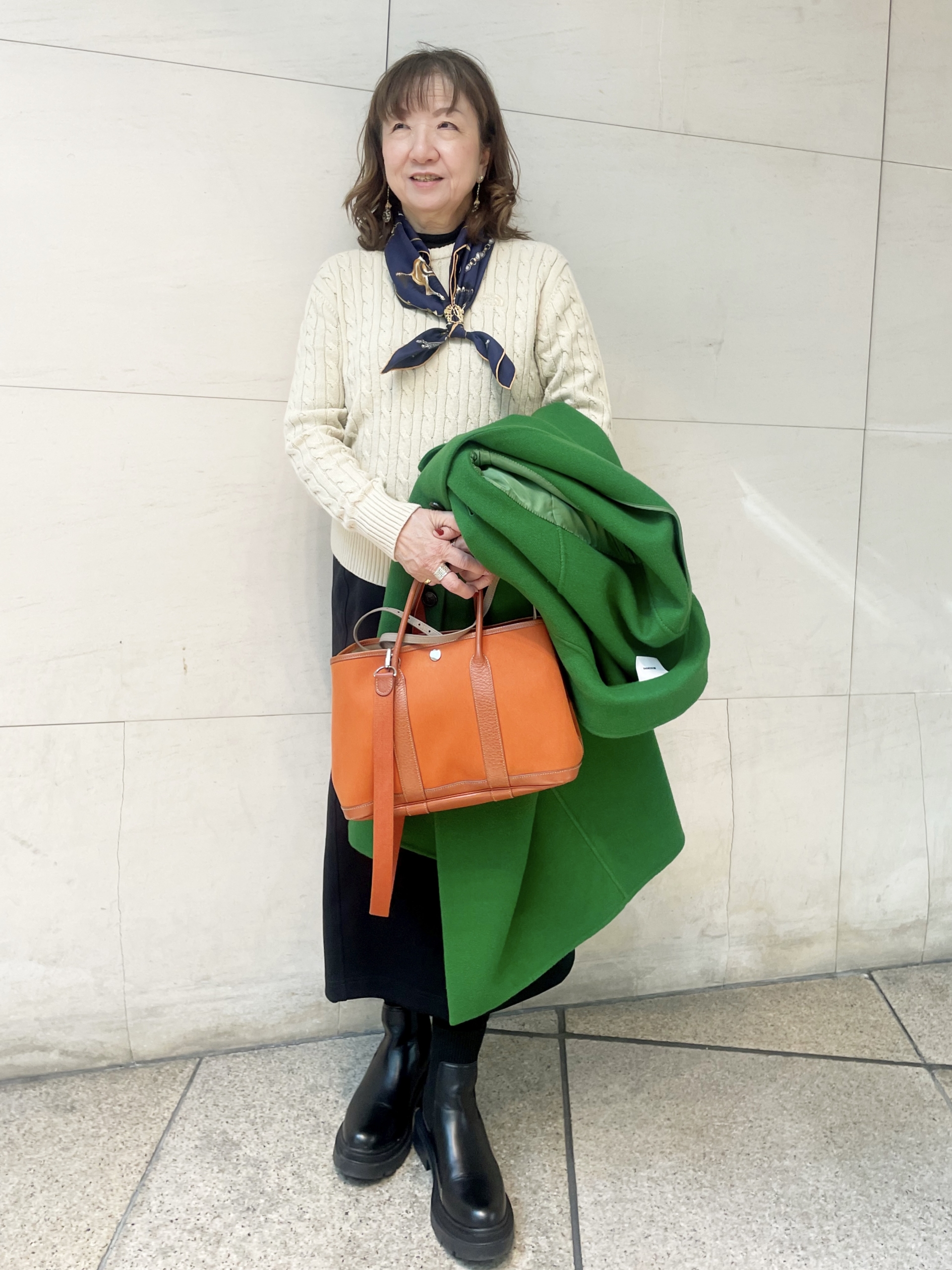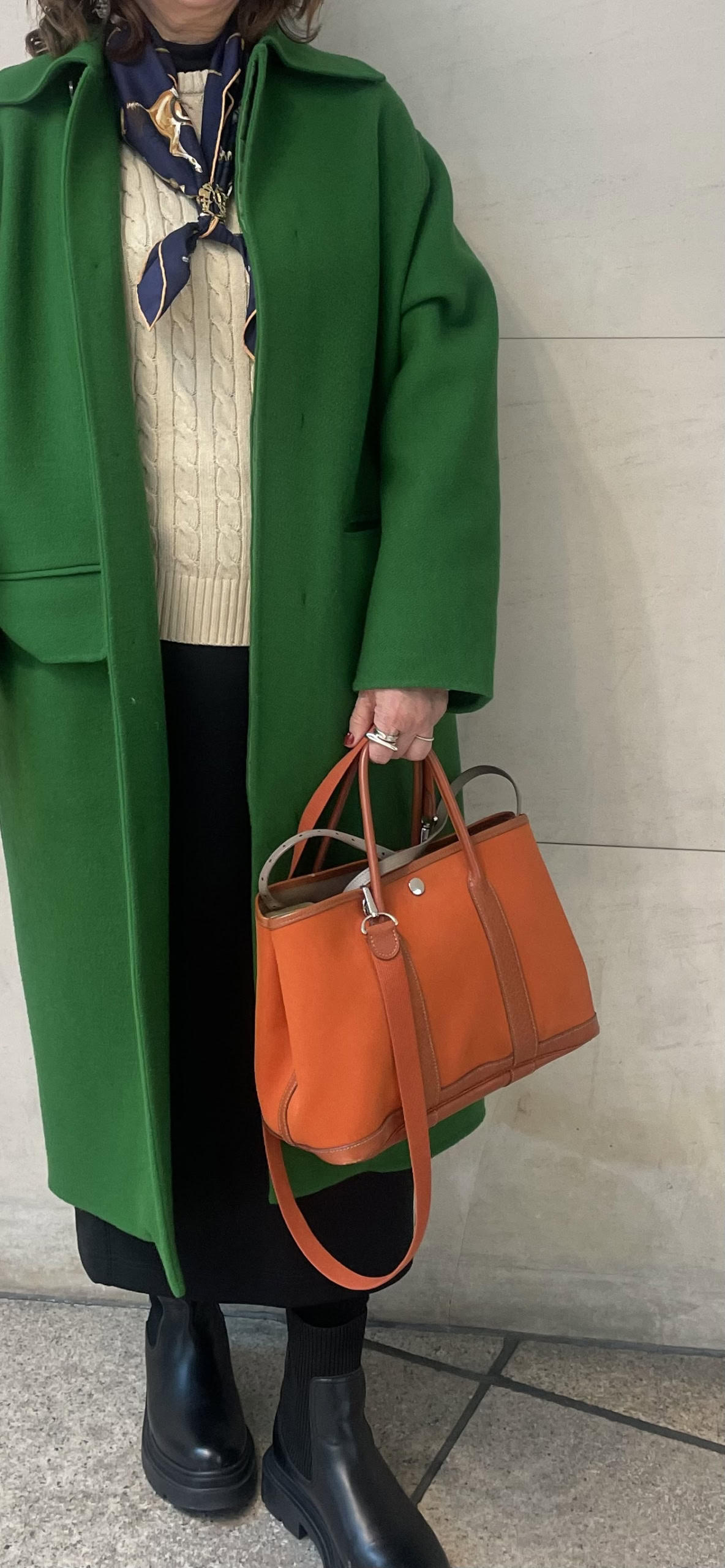「今日は鮮やかなコートとバッグが主役のコーデ。コートは『ミースロエ』で、羽織るだけで気分が上がるお気に入りの1着です。『エルメス』のバッグは、20年前にハワイで主人に買ってもらった思い出のもの。オレンジが可愛く、元気が出ます」