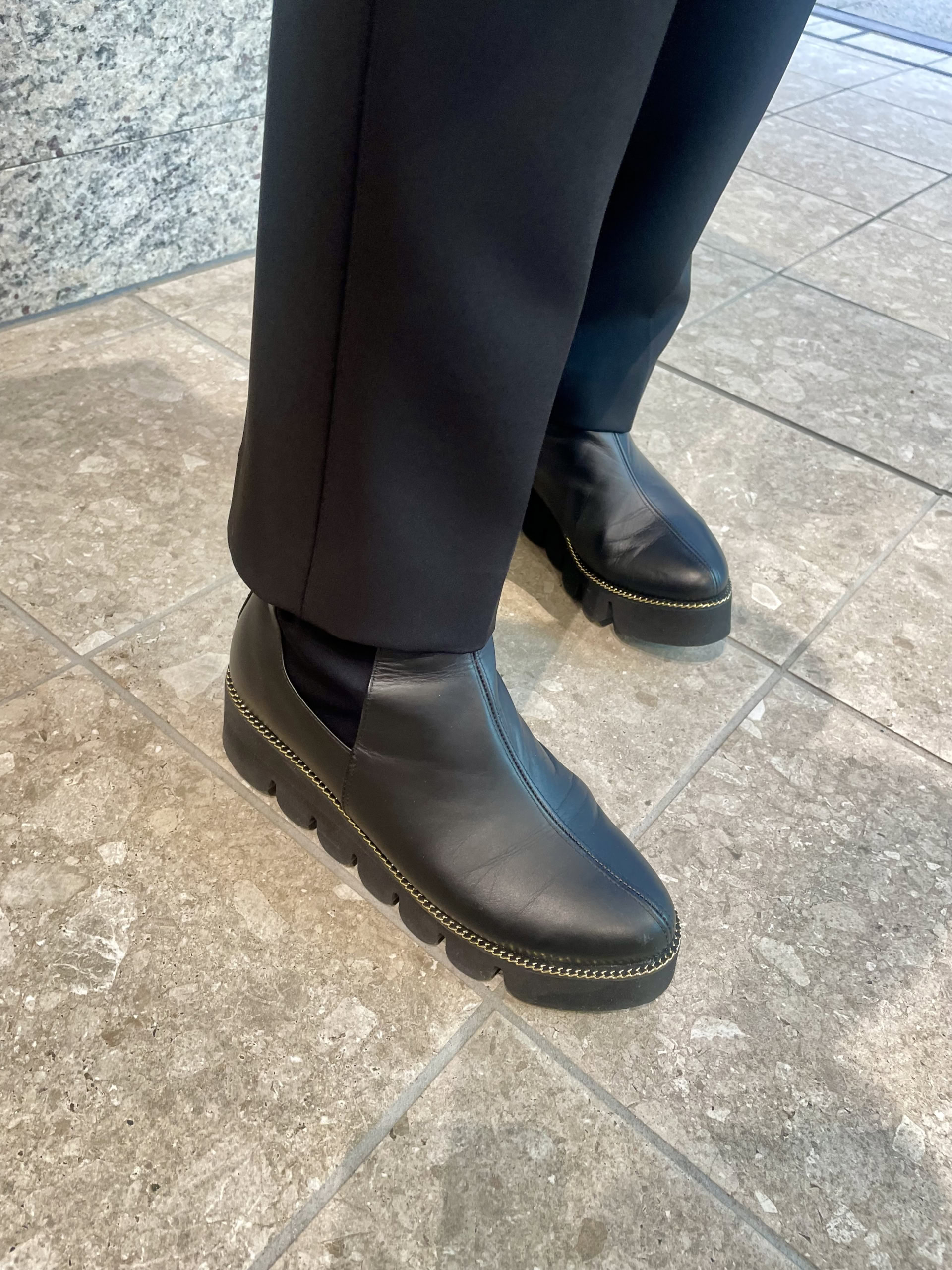シューズは『ヒルズアヴェニュー』。とにかく歩きやすいのと、程よいソールの厚みのおかげでスタイルアップでき、毎日のように履いているお気に入り!波デザインのソールで、厚底でも軽やかに」