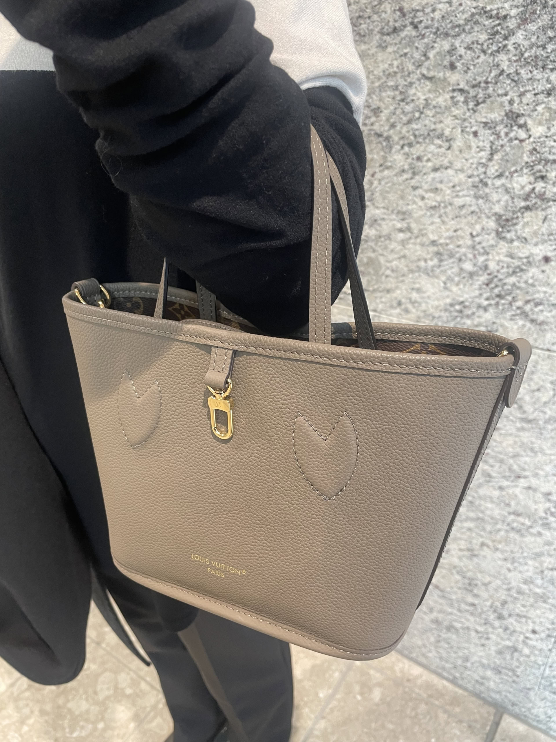 「モノトーンのお洋服にも浮かないグレージュカラーとサイズ感が使用しやすい『ルイ・ヴィトン』のバッグ。リバーシブルになっていて、気分やシーンによって変えています。