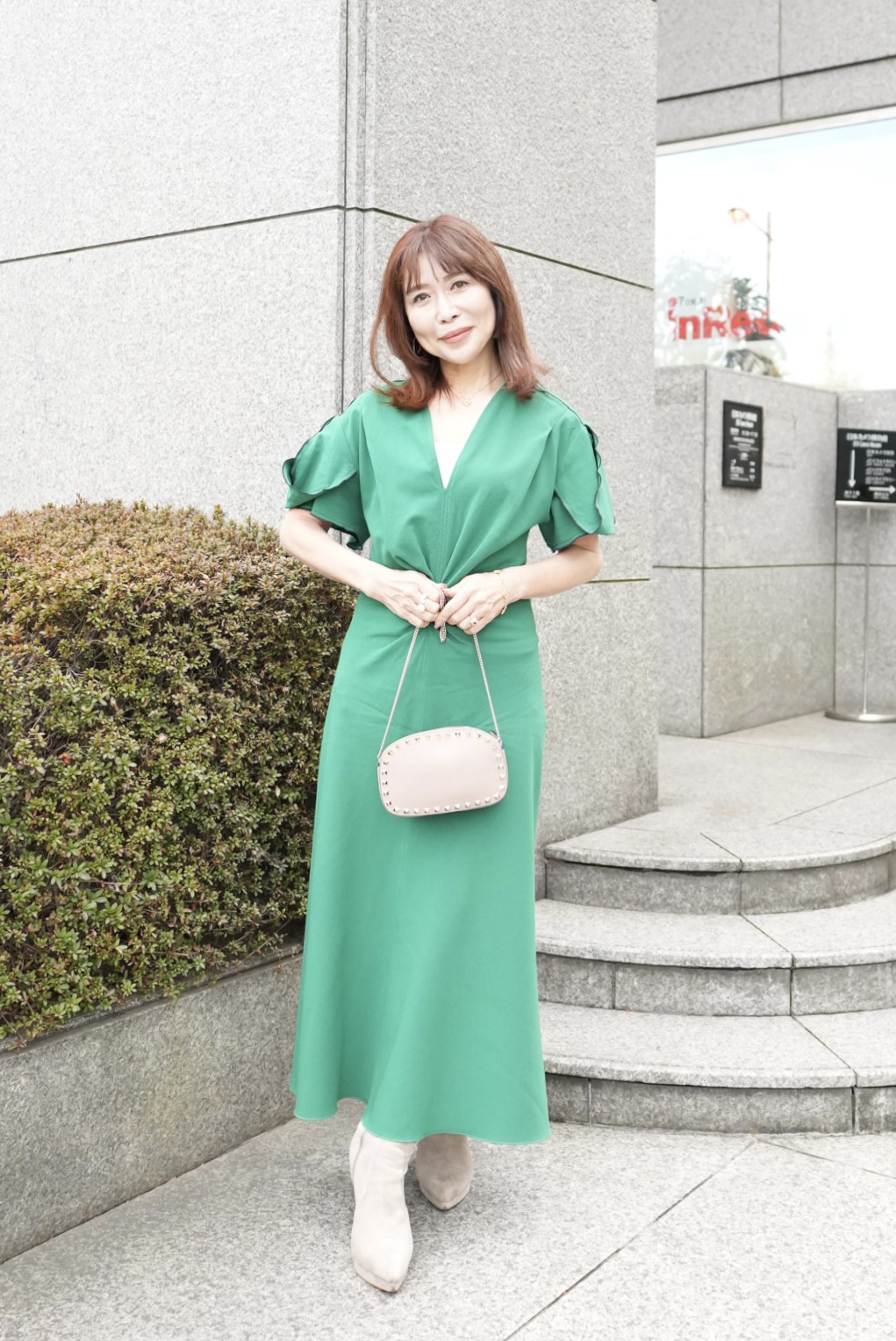 「鮮やかなグリーンにはあえてニュアンスカラーのベージュを小物にセレクトして、ワンピースの雰囲気を崩さないように意識しました」