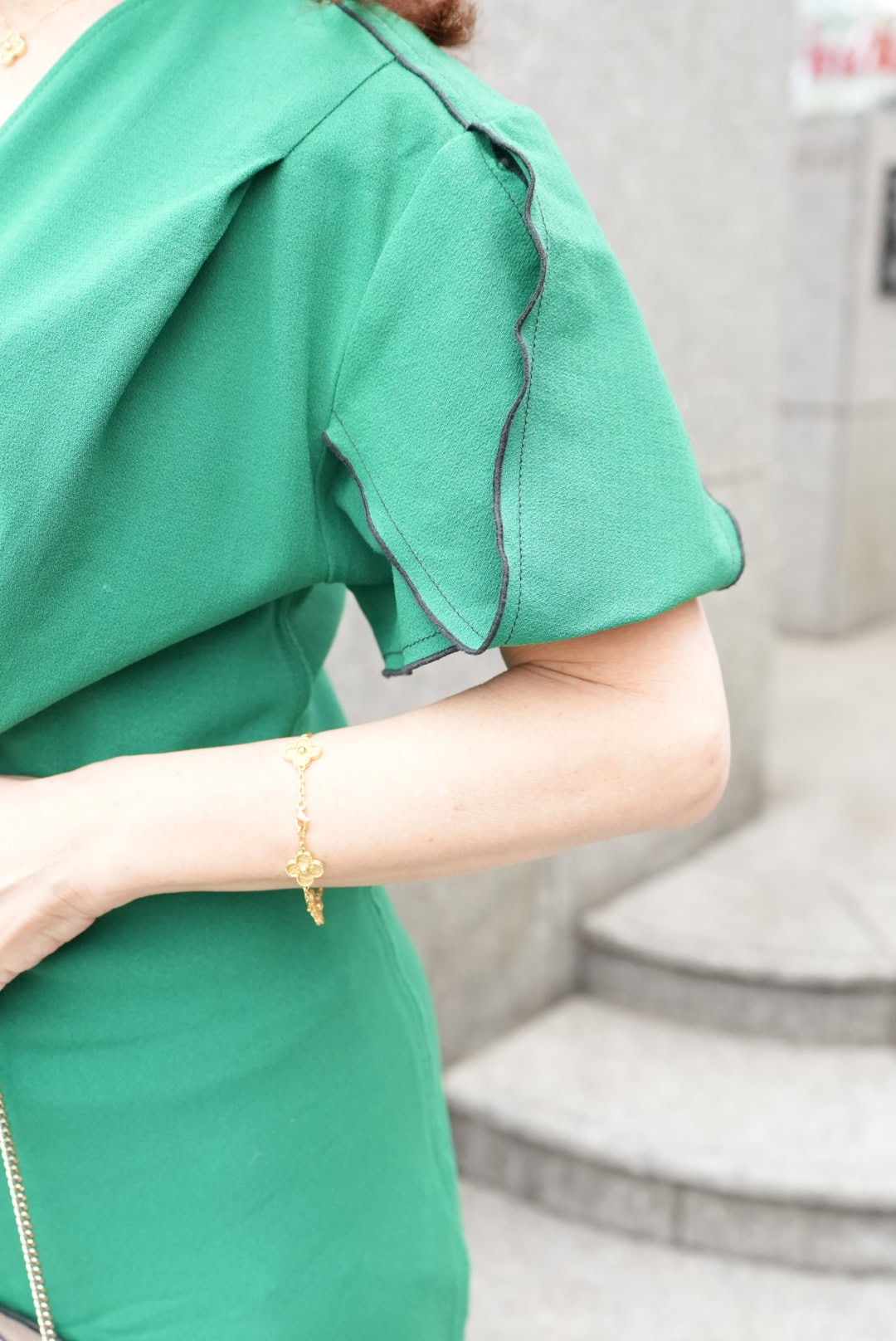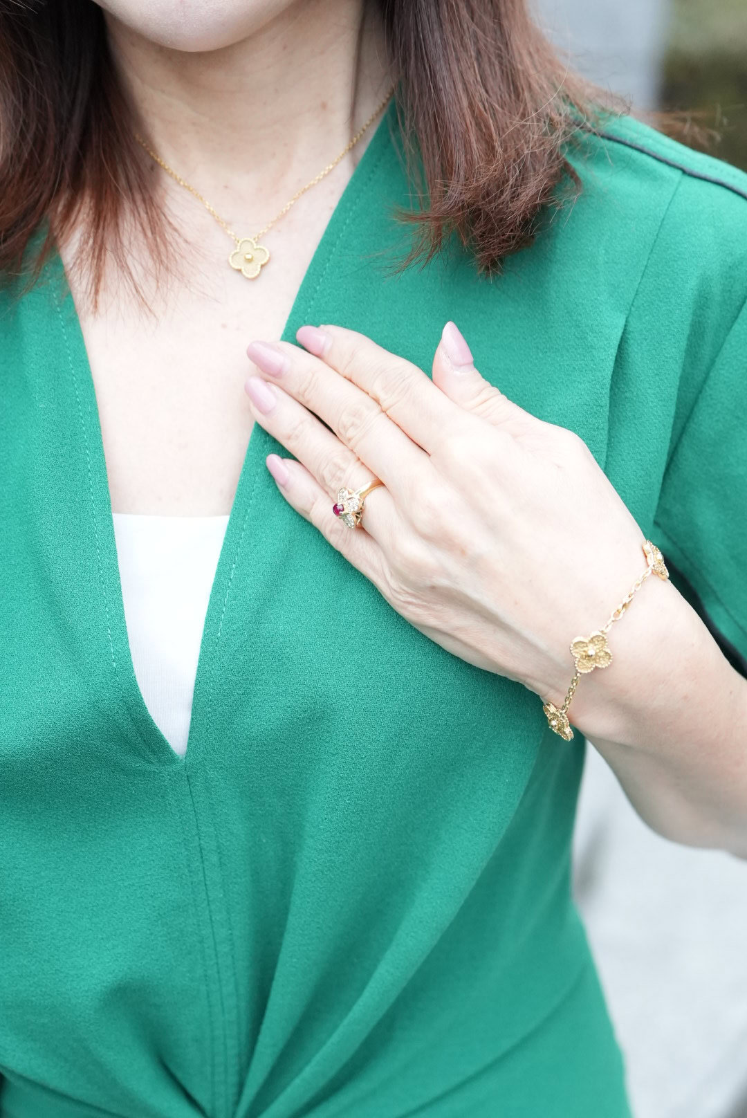 「ジュエリーはお気に入りのヴァンクリーフアーペールのゴールドで統一感を。ゴールドのリングともマッチするのでお気に入りの組み合わせです」