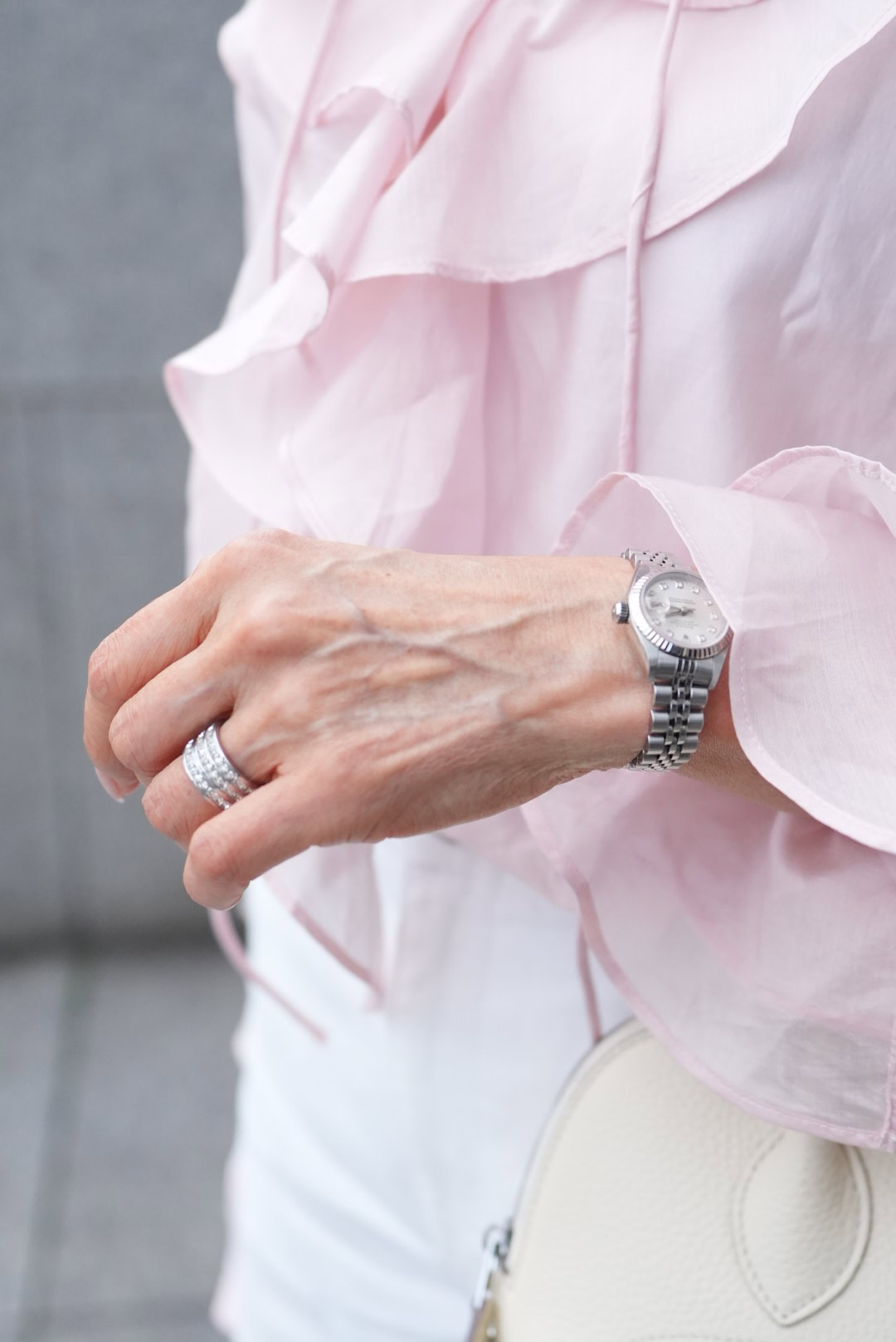「シルバー色のアクセサリーが好みなので、リングや時計、ネックレスは色味を統一。春の軽快な輝きを放ち」ながらも大人なあ着こなしへとアップデートしています」