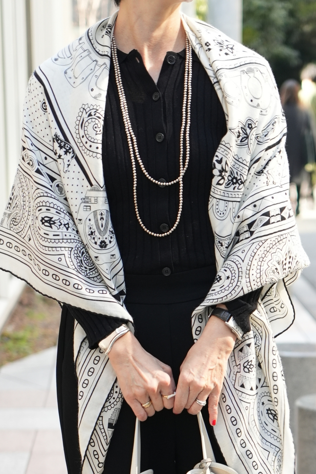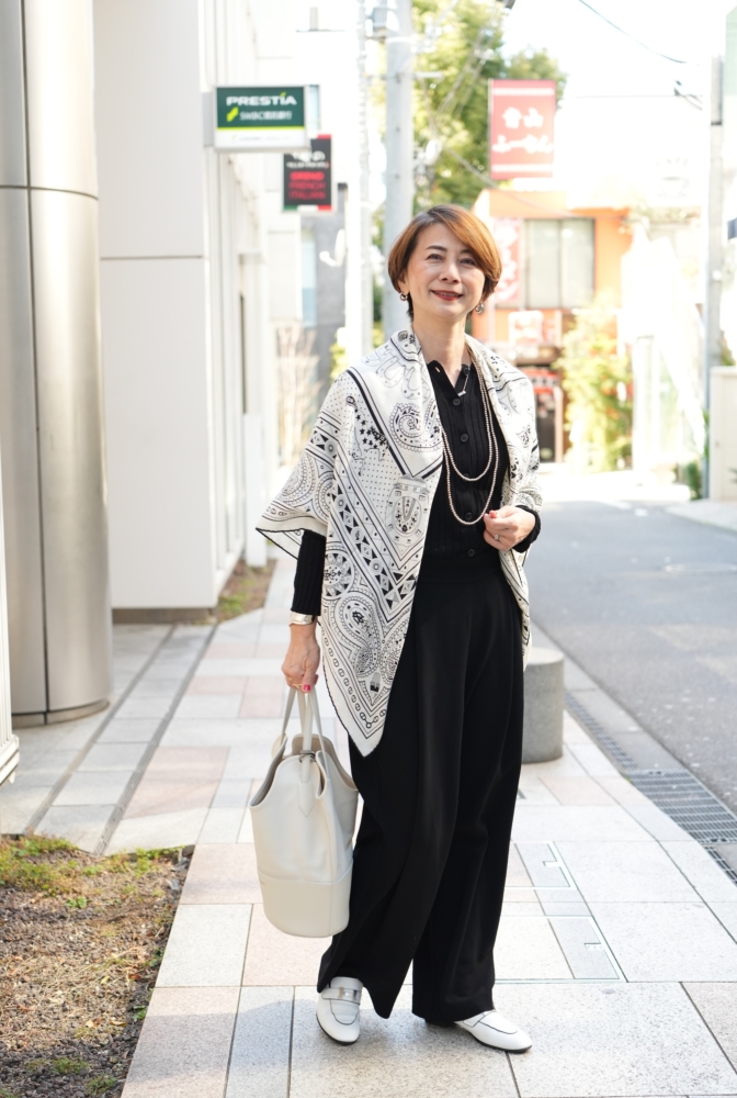 「モノトーンなどシンプルなコーデが好きなので、コーデに春らしく軽やかさをもたらすためにモノトーンながらも繊細な柄のエルメスのカシシルを主役に。ただ首にかけるだけなのですが、トップスとボトムスを黒に統一してIラインを協調することで、カシシルの動きが軽やかに見えます」