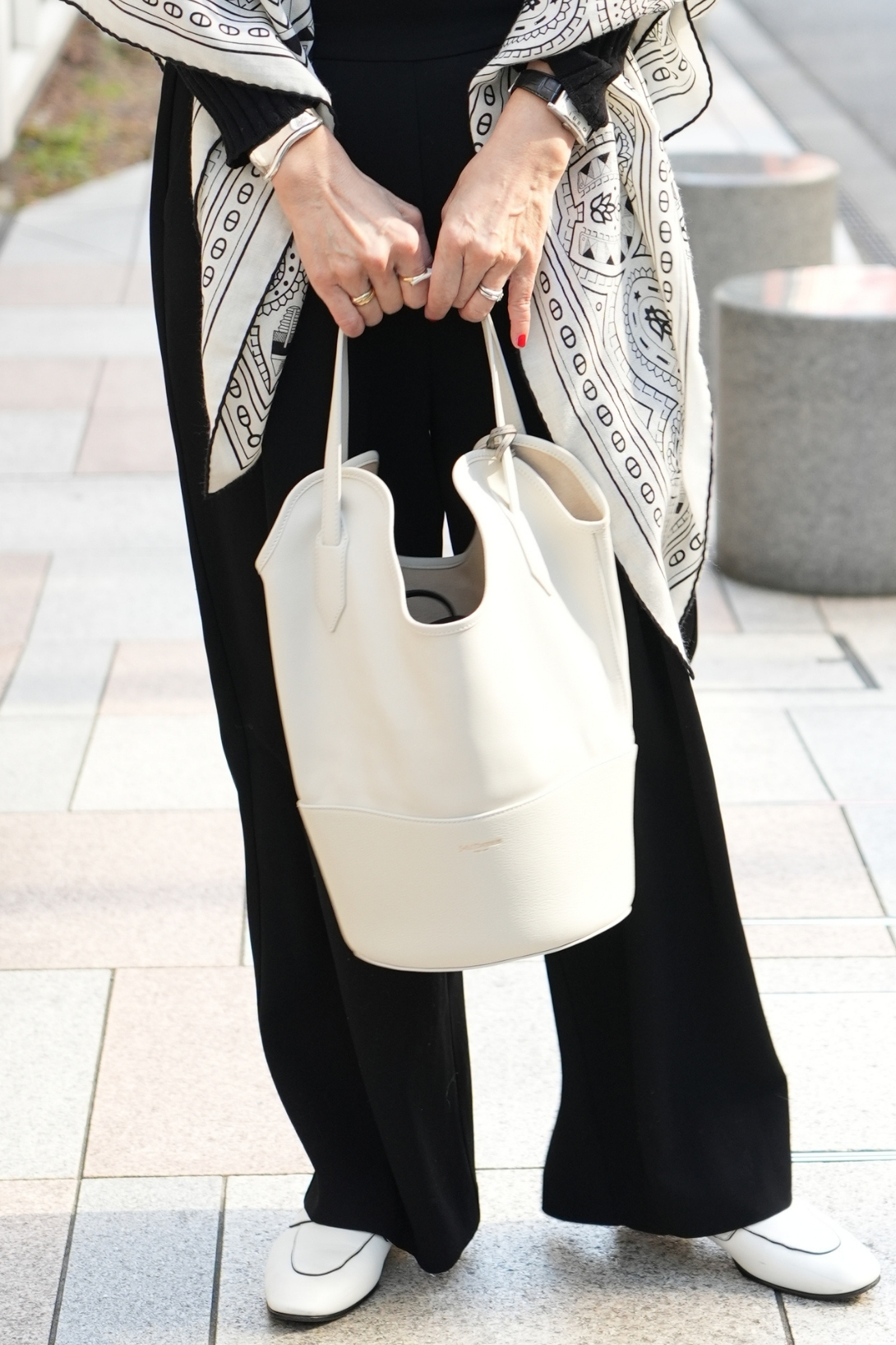 リラクシーなシルエットなのに、モノトーンの色づかいで引き締めつつも重くならない絶妙な配色バランスにまとめていますね。柔和なニュアンスカラーアイテムを投入せず、白・黒のみで春っぽさを感じさせるテクニックには脱帽です。