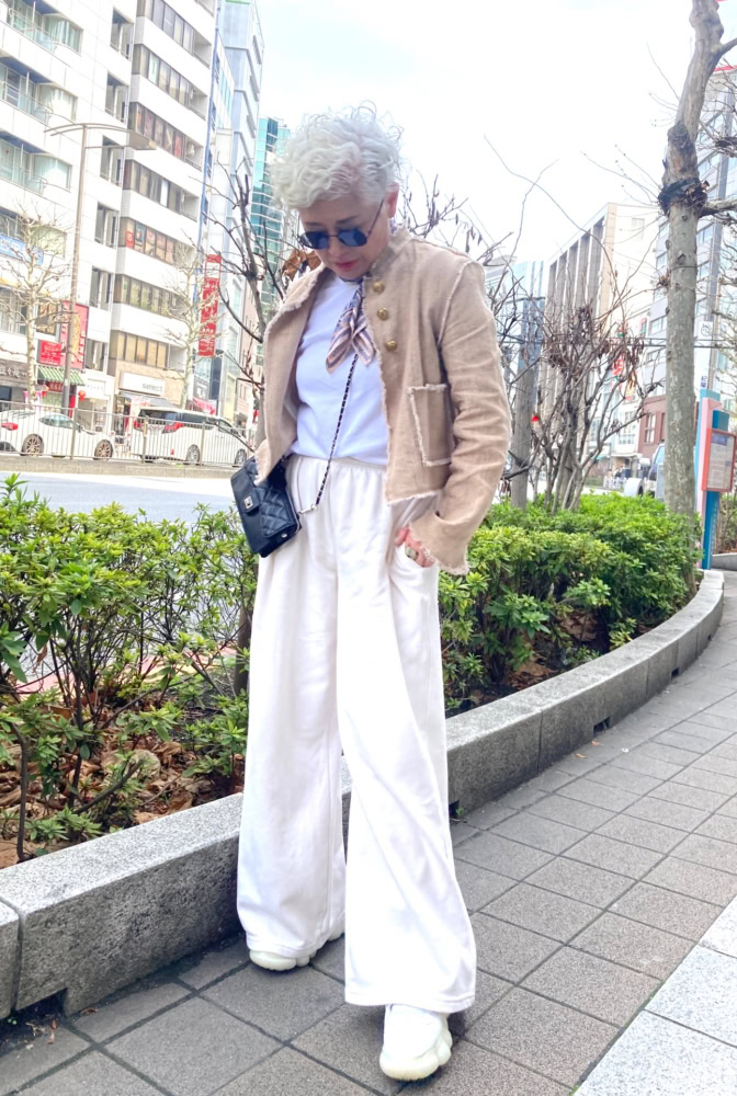 自然体でカジュアルなアイテムながらも、エレガントさを含むアイテムたちが巧みなバランスで大人な装いへと昇華していますね。ホワイトスニーカーで足元まで色を揃えることでスタイルUP効果もテキメンです。
