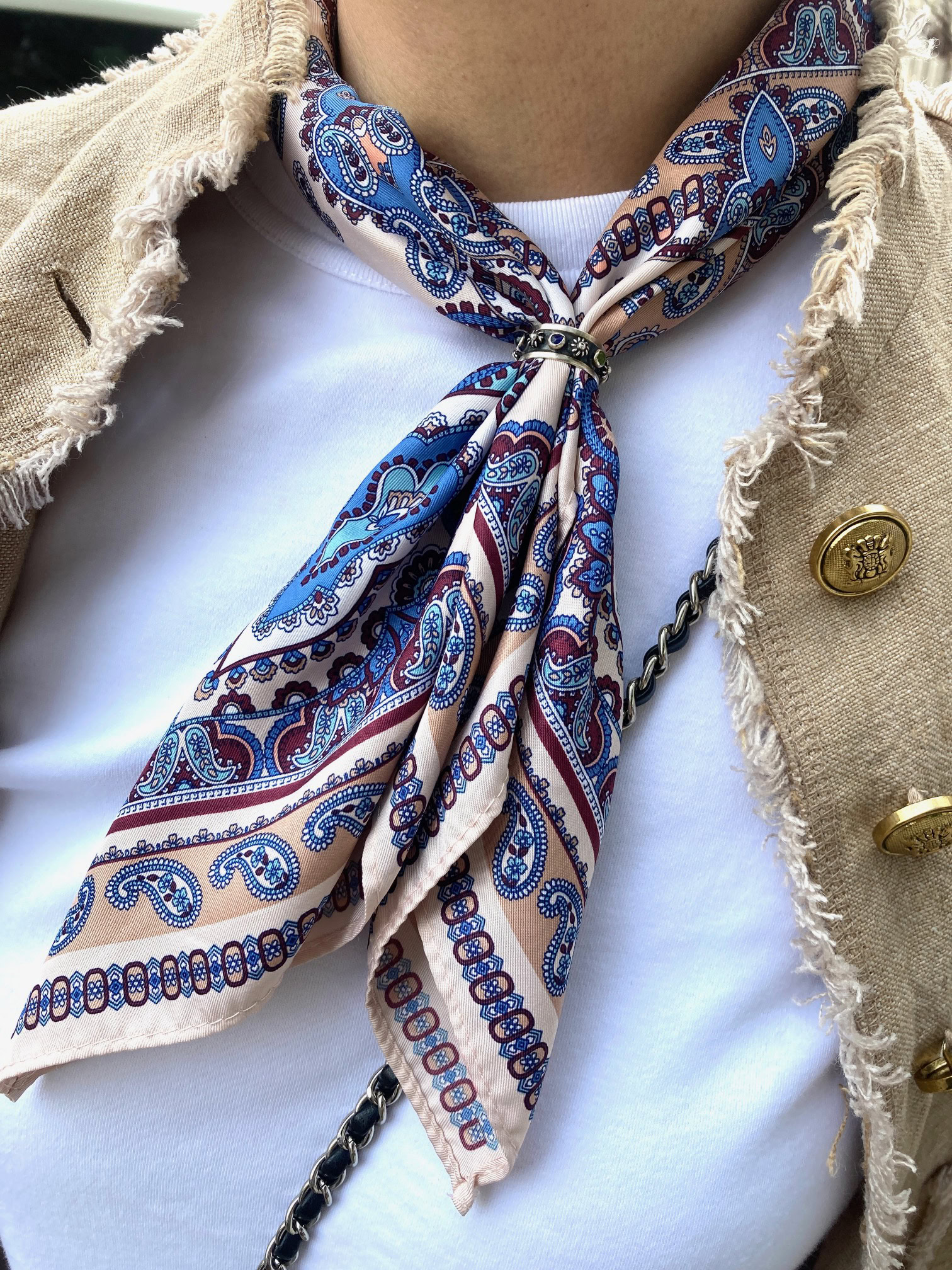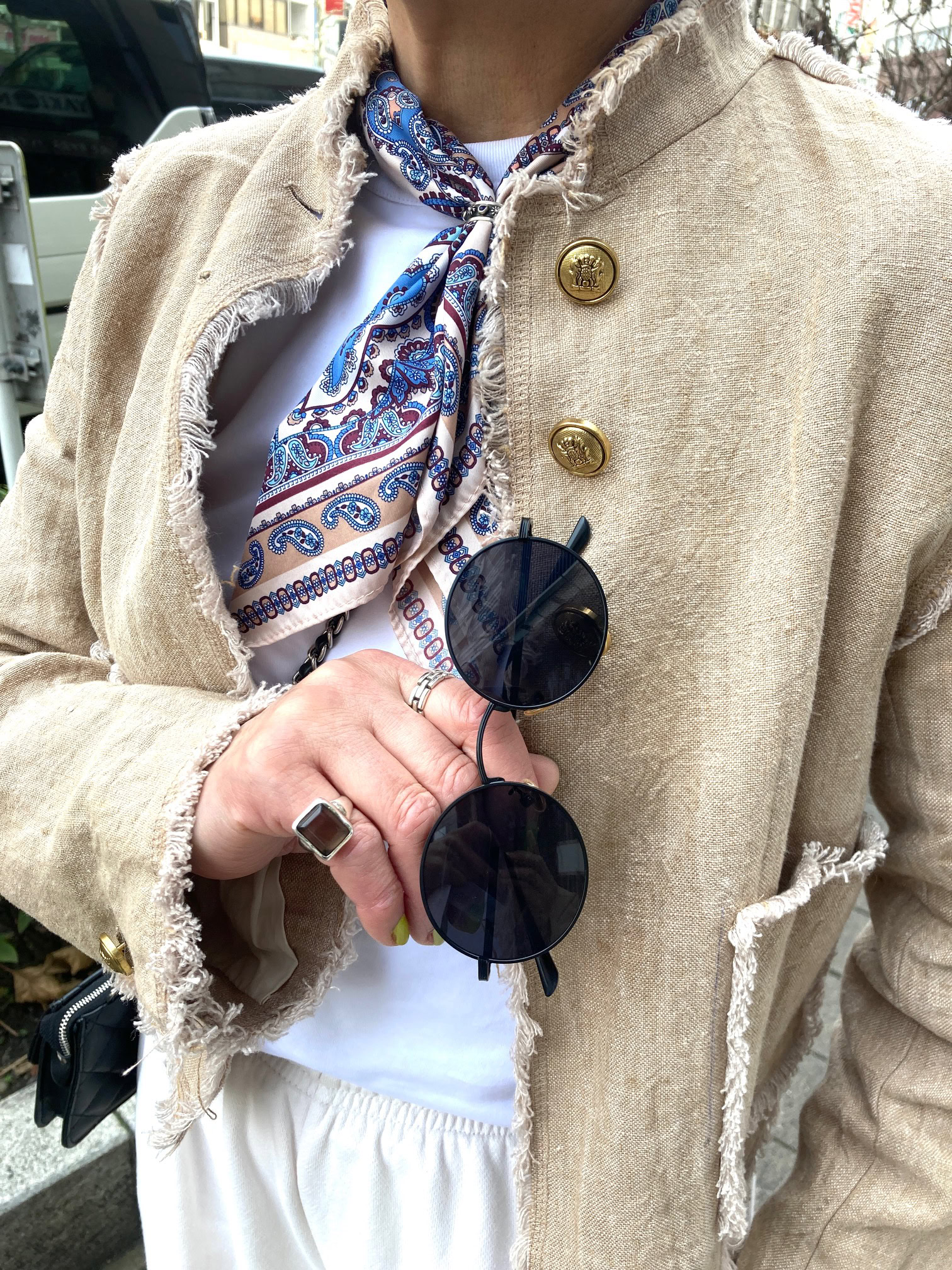 「繊細な柄のスカーフで首回りをアレンジ。ジャケットとも相性バッチリで、顔まわりがほどよく映えるポイントに」