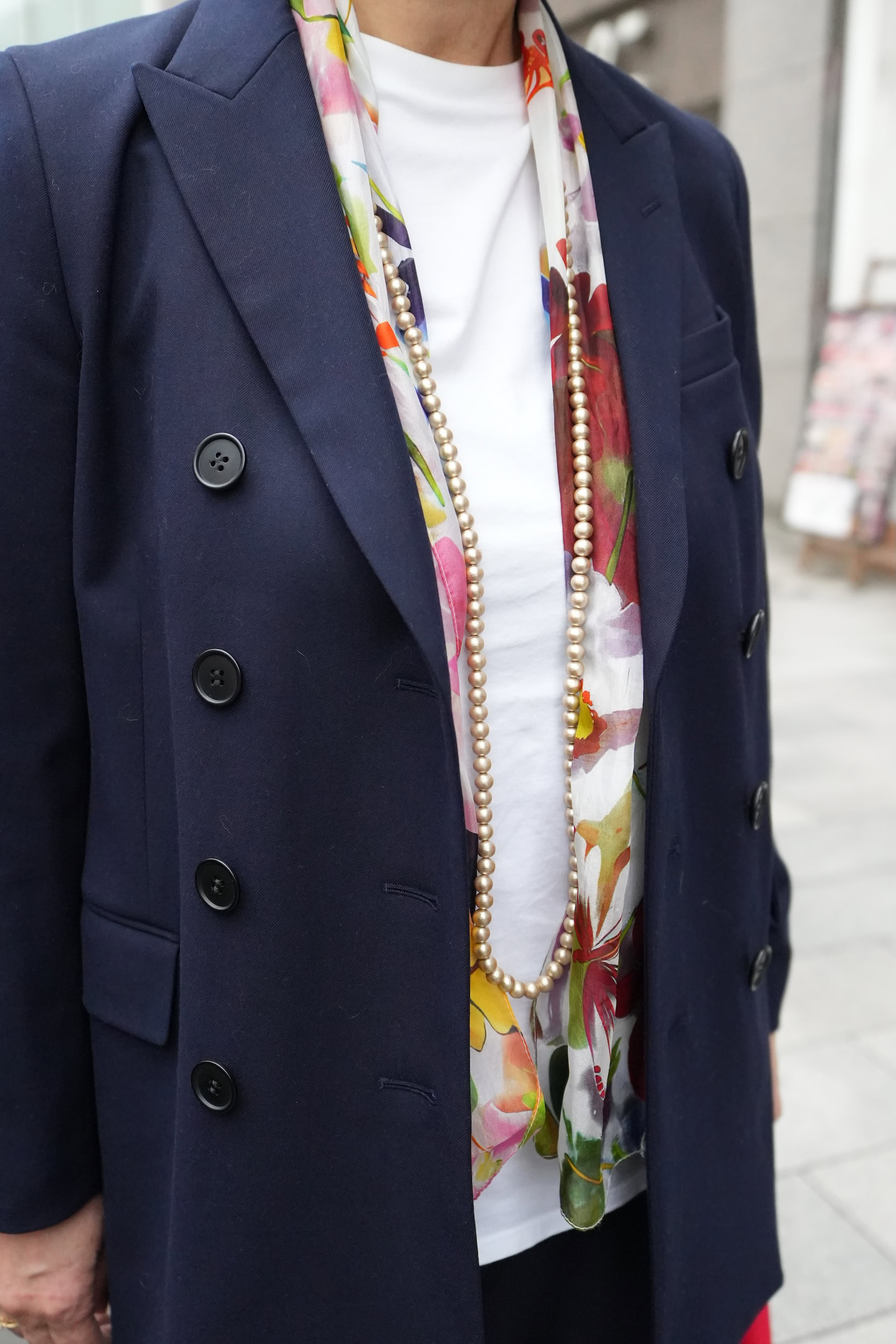 「スーツはともするとビジネスライクにも見えてしまうので、カラフルな花柄のスカーフとパールのロングネックレスをプラス。やわらかくエレガントな印象に仕上がります」