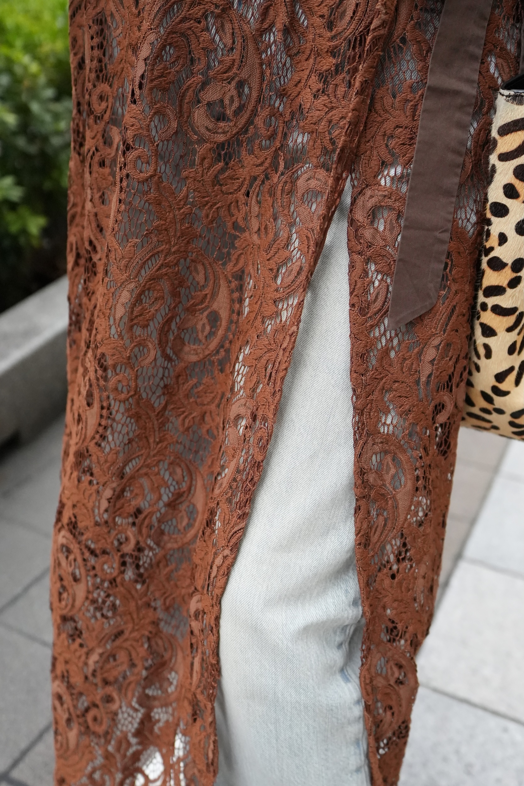 「最近インスタでレースのスカートコーデをよく見かけるので、ずいぶん前に購入したものですが『SLOBE IENA』のブラウンのレーススカートをデニムにレイヤード。トップスは『GU』のシアー感があるカットソーで季節感を狙ったものの、寒暖差もあるのでスカートの色に合わせたブラウンのスウェットを肩掛けしてみました」